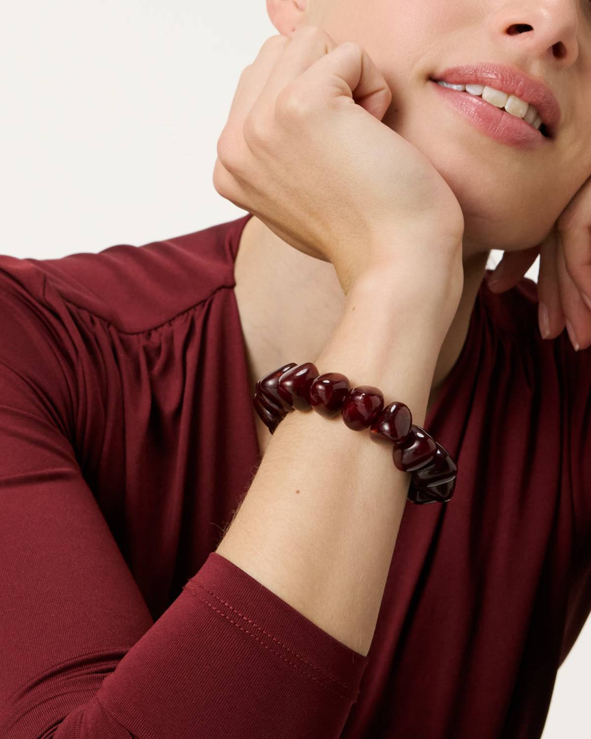 Chunky little treasures! Das Stone Flex Bracelet in Bordeaux Marble vereint tiefrote, marmorierte Steine mit goldenen Highlights. Jede Perle hat ihren eigenen Charakter – mal rundlicher, mal eckiger – und genau das macht den Charme aus. Ein Armband, das Spaß macht, auffällt und deinem Look sofort Persönlichkeit gibt.