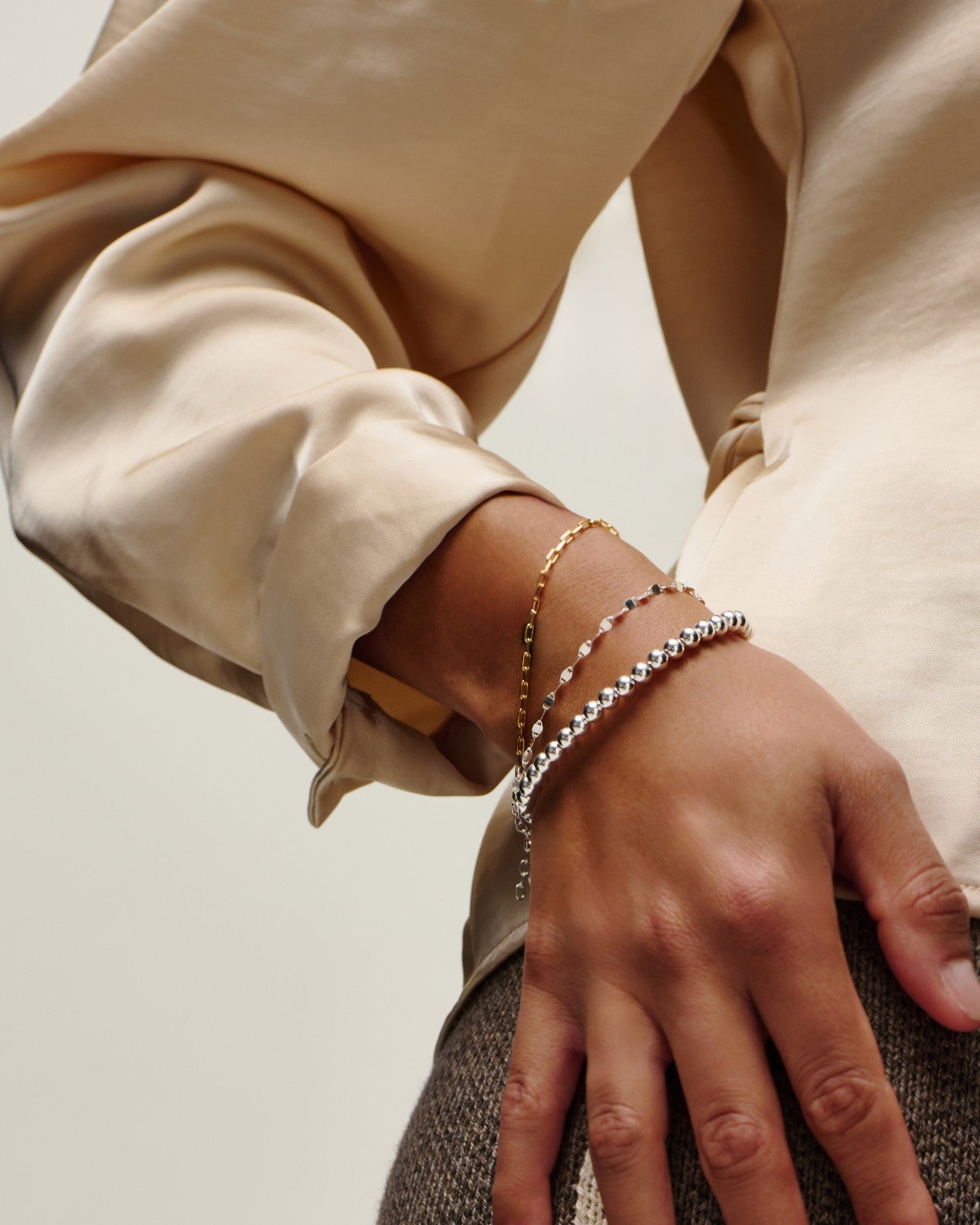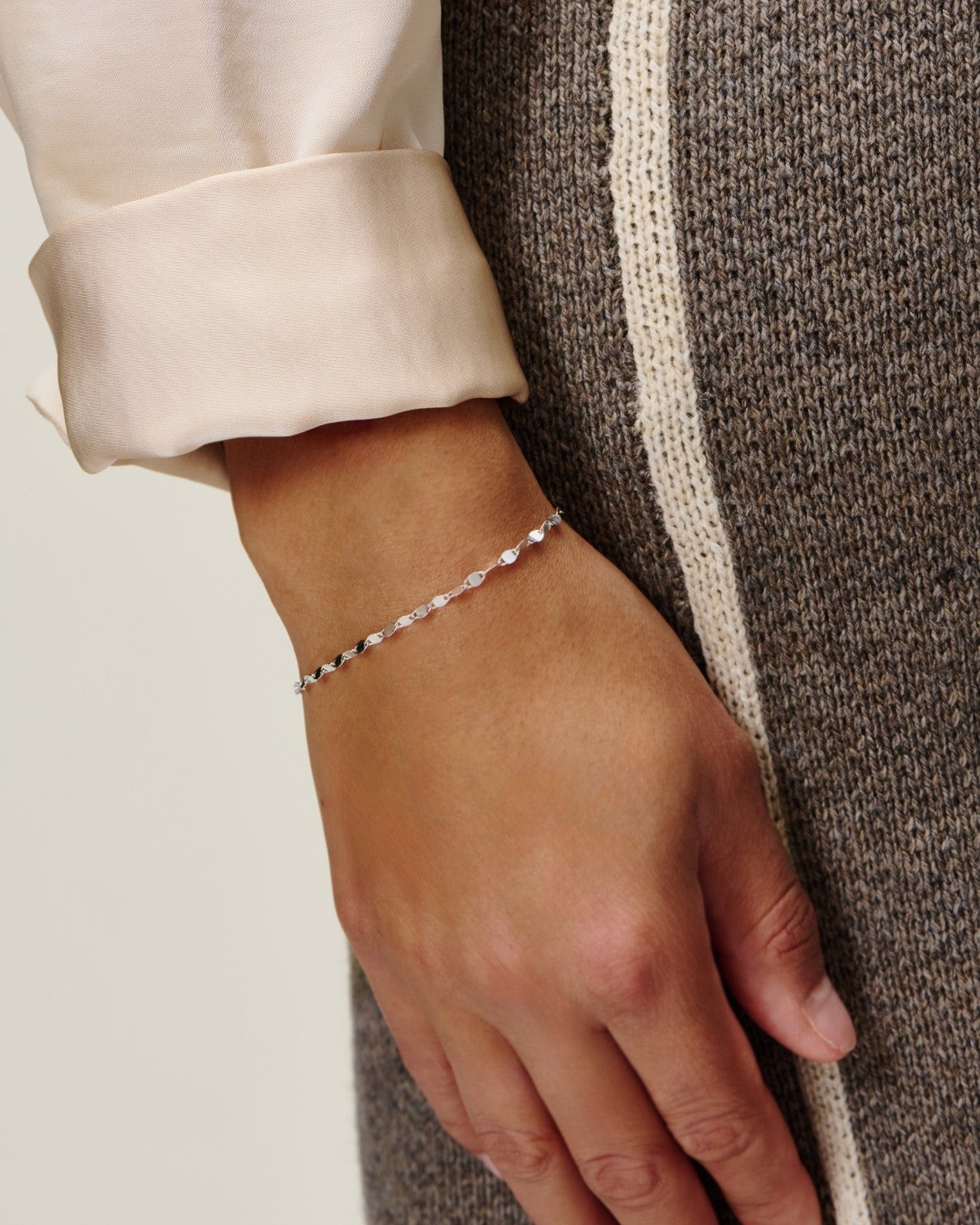 Das edle Florentina Armband aus recyceltem 925 Sterling Silber überzeugt mit seiner zeitlosen Eleganz. Es kann wunderschön alleine, als subtiler Akzent, getragen werden. Im Layering-Look mit anderen Armbändern ist es der perfekte Allrounder, der sowohl zu Boho, als auch minimalistischen Looks passt.