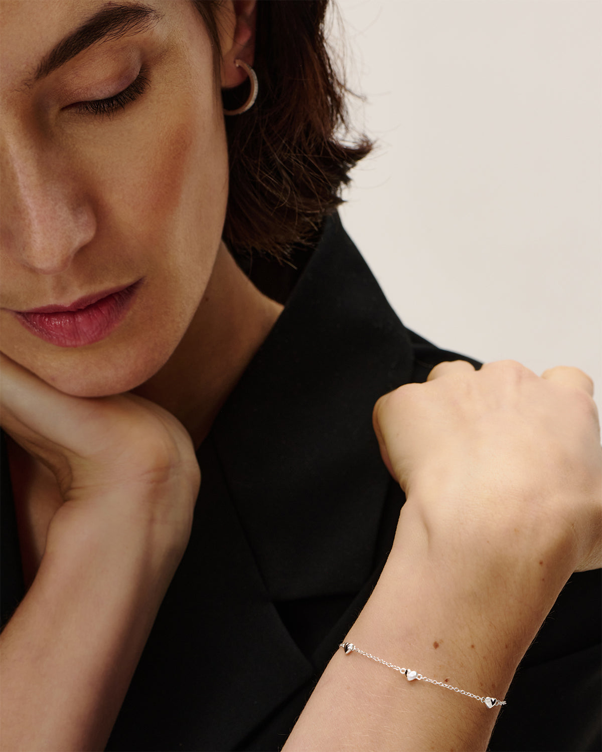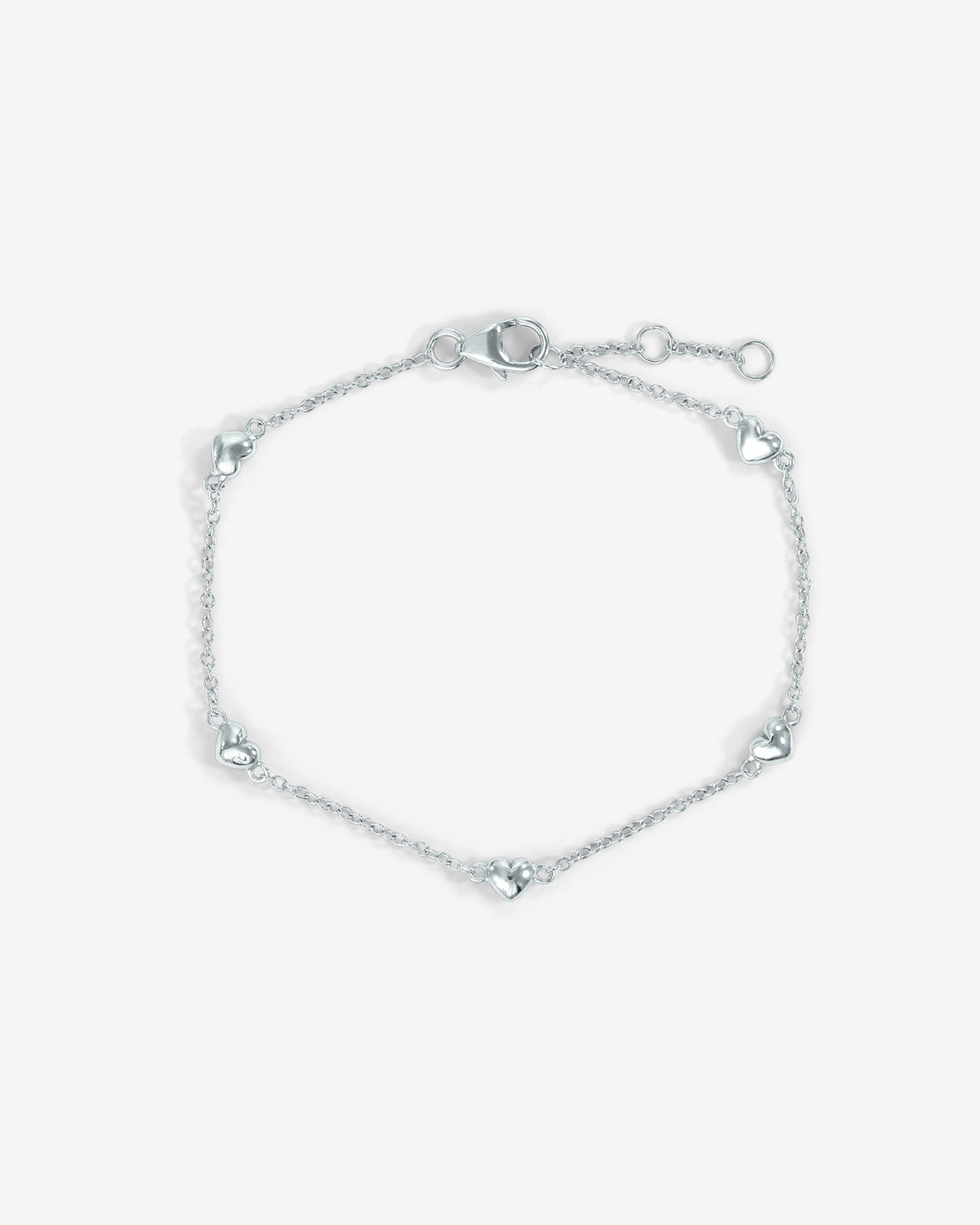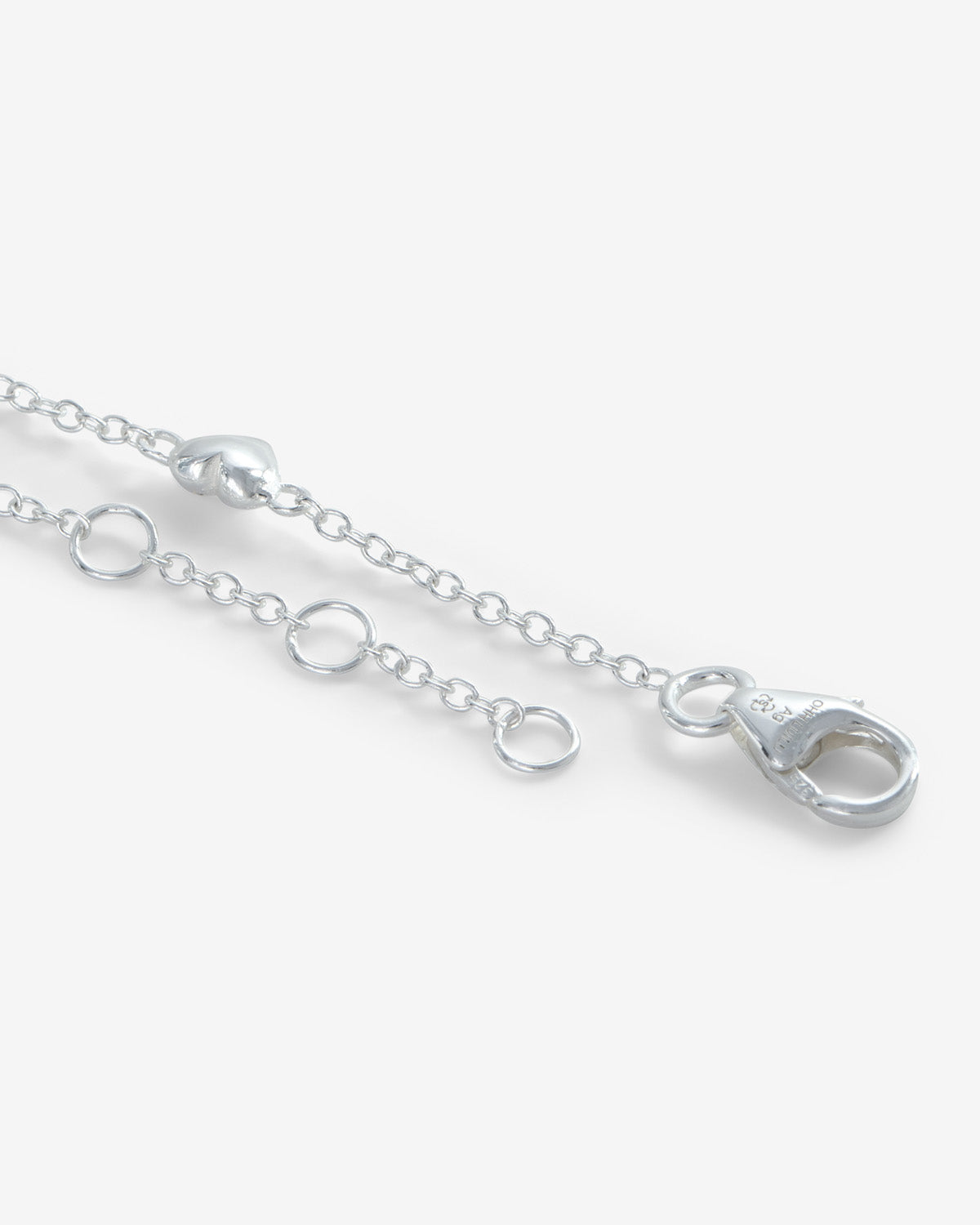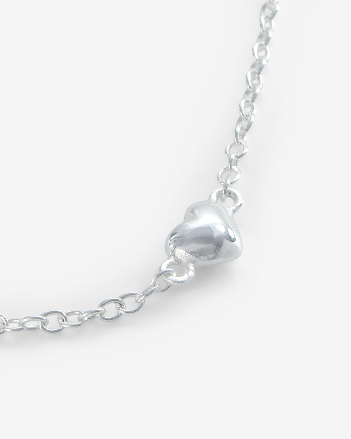 Das Mini Love Path Armband setzt auf eine zarte Kette mit kleinen Herzdetails, die wie eine feine Linie das Design prägen. Das kühle Silberfinish unterstreicht die klare Form und sorgt für eine frische, leichte Wirkung. Locker am Handgelenk getragen, wirkt das Armband zurückhaltend, aber nicht unauffällig – filigran, verspielt und angenehm modern.