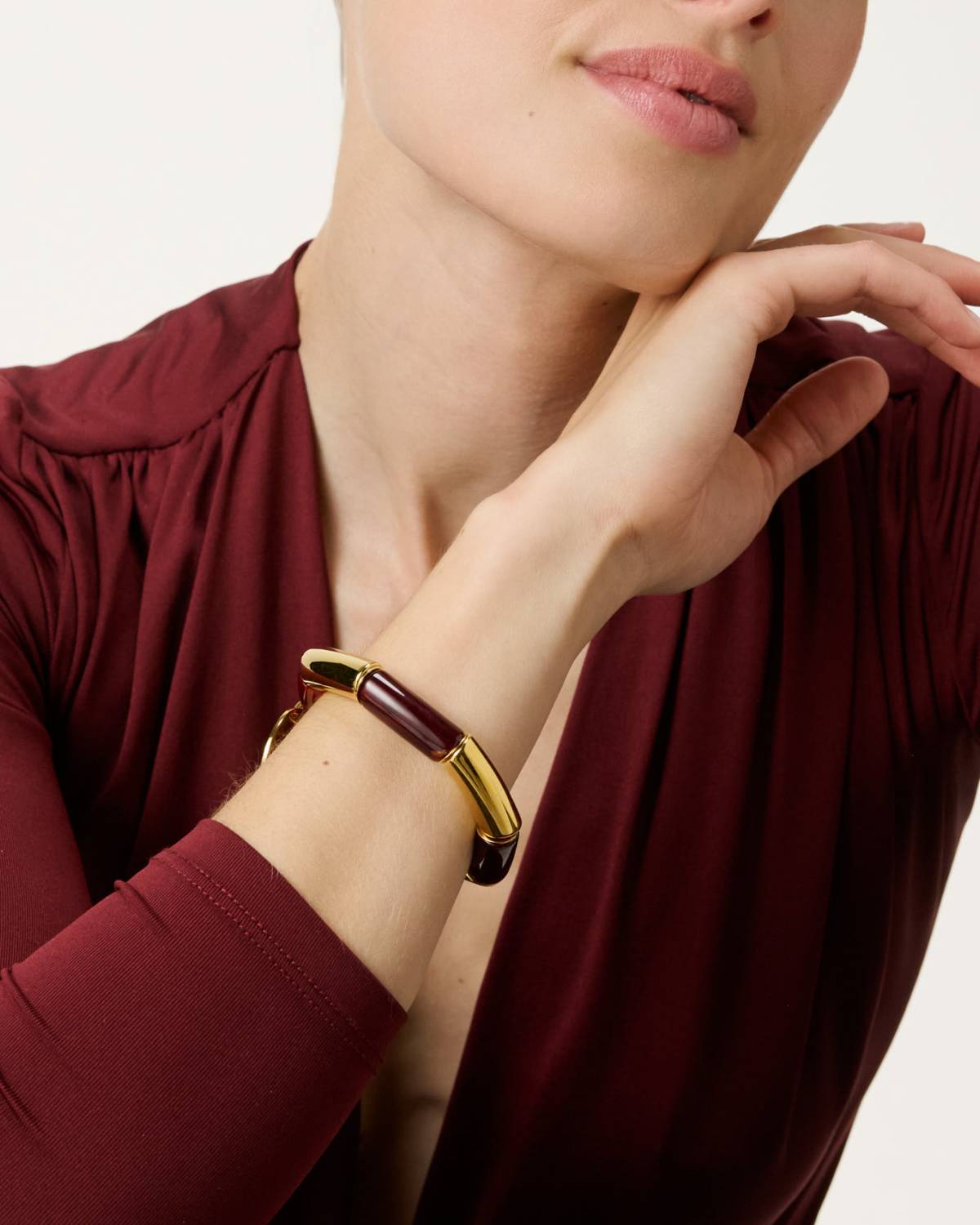 Gold meets Bordeaux! Das Flex Bracelet bringt mit seinem Mix aus glänzendem Gold und marmorierten Elementen ein verspieltes Statement ans Handgelenk. Der Kontrast der Farben sorgt für einen modernen Twist – ein Accessoire, das Spaß macht und immer ein Hingucker ist.
