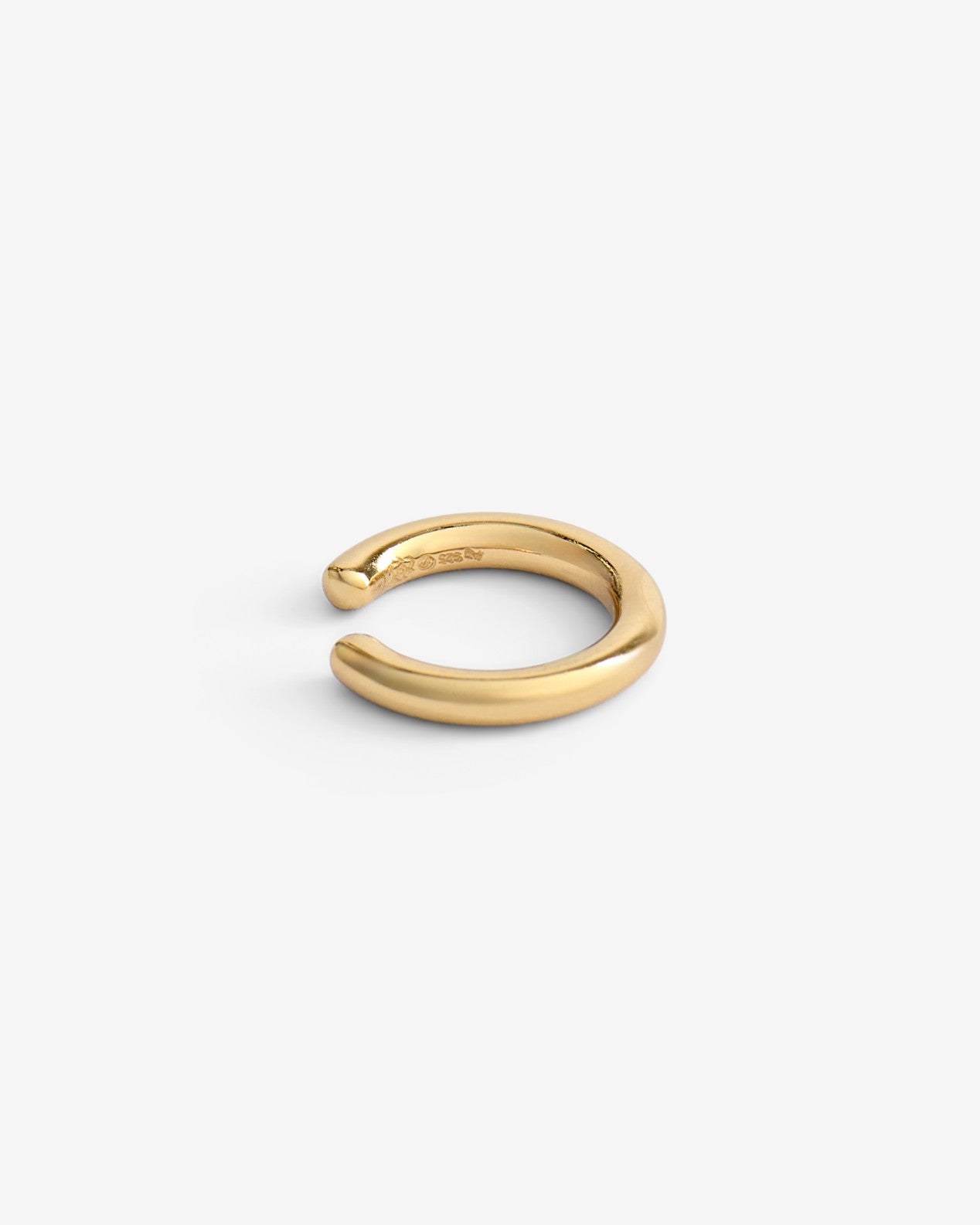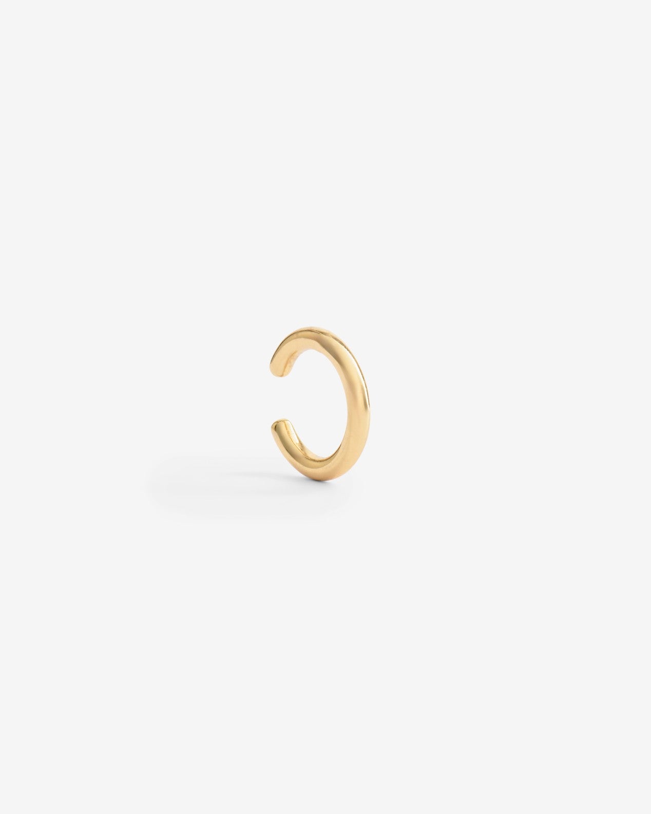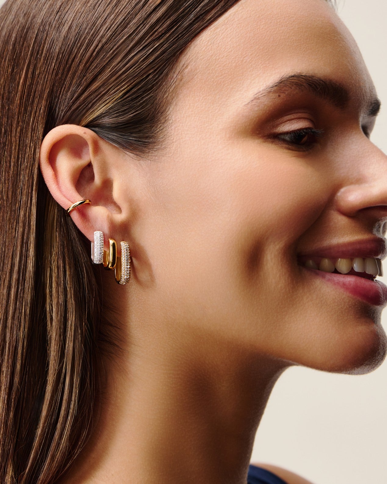 Dass goldene Ringe neben Fingern auch das Ohr kunstvoll in Szene setzen, beweist dieser Earcuff des Labels Pompidou. 18-karätiges Gold überzieht den Ohrschmuck aus Sterlingsilber und spiegelt durch seine glänzende Oberfläche das Strahlen in den Augen der Trägerin wider. Das puristische Design harmoniert mit jedem Look und gliedert sich optimal in trendige Ear-Party-Looks ein.