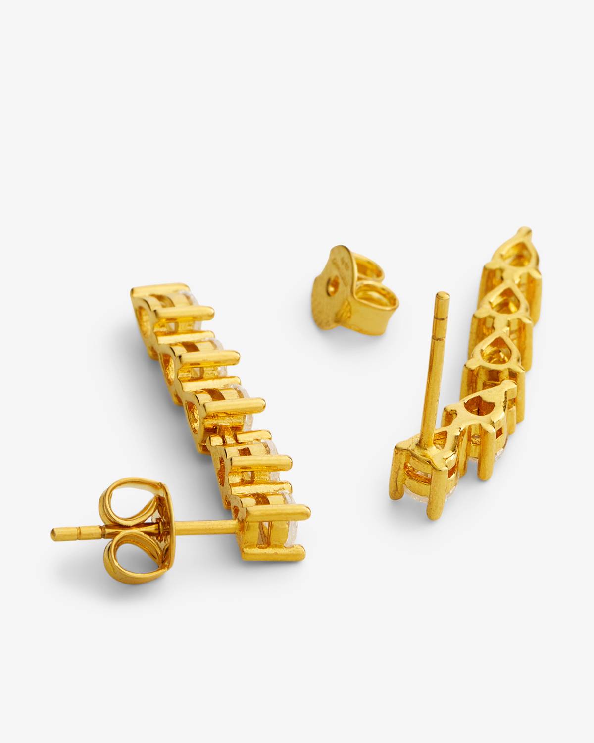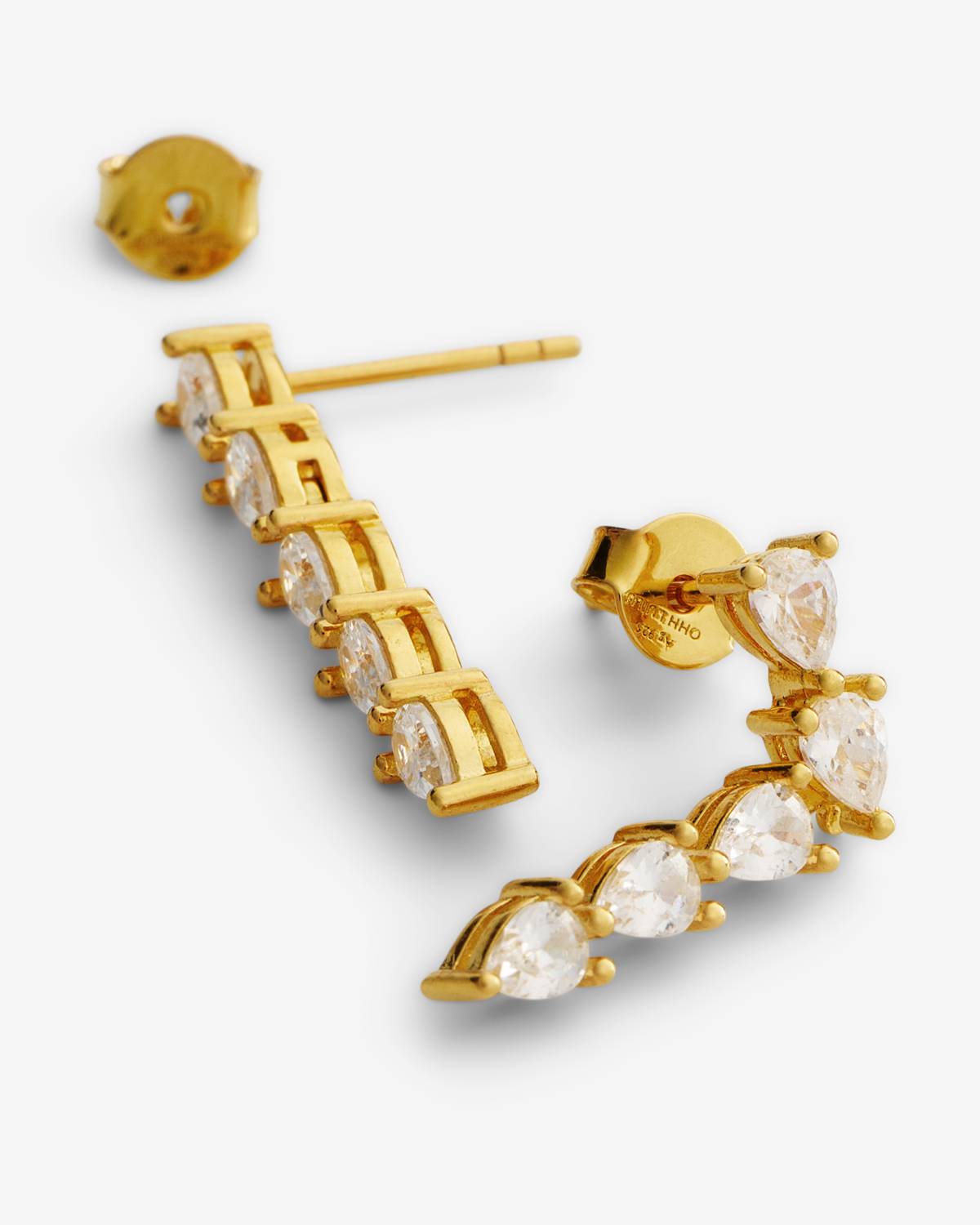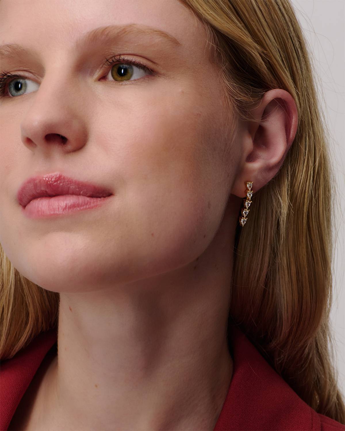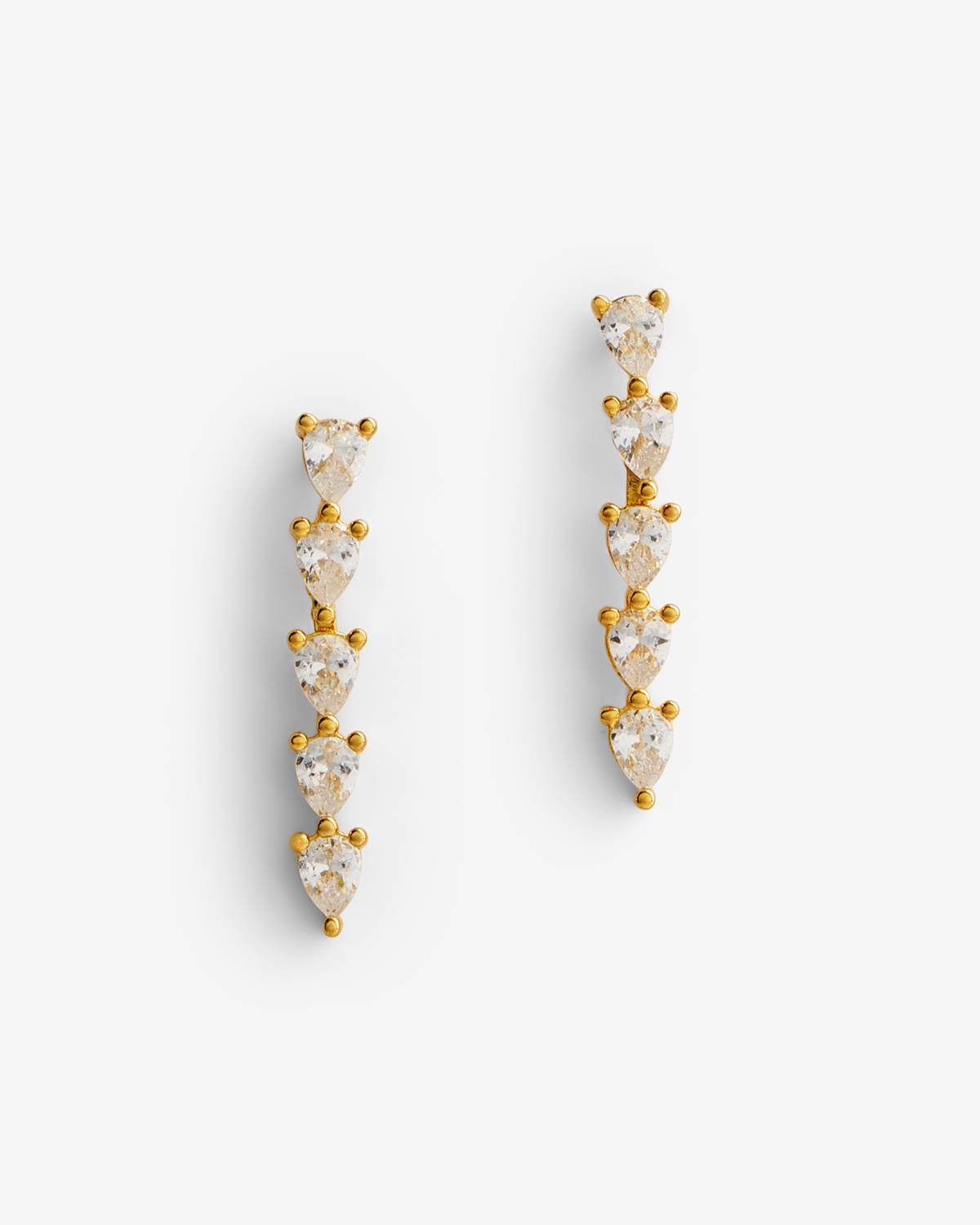 Die Pear Drop Earrings in 18kt Vergoldung bringen Glam pur ans Ohr. Fünf funkelnde white zirconia Steine in edler Tropfenform reflektieren das Licht bei jeder Bewegung – elegant, bold und einfach wow!