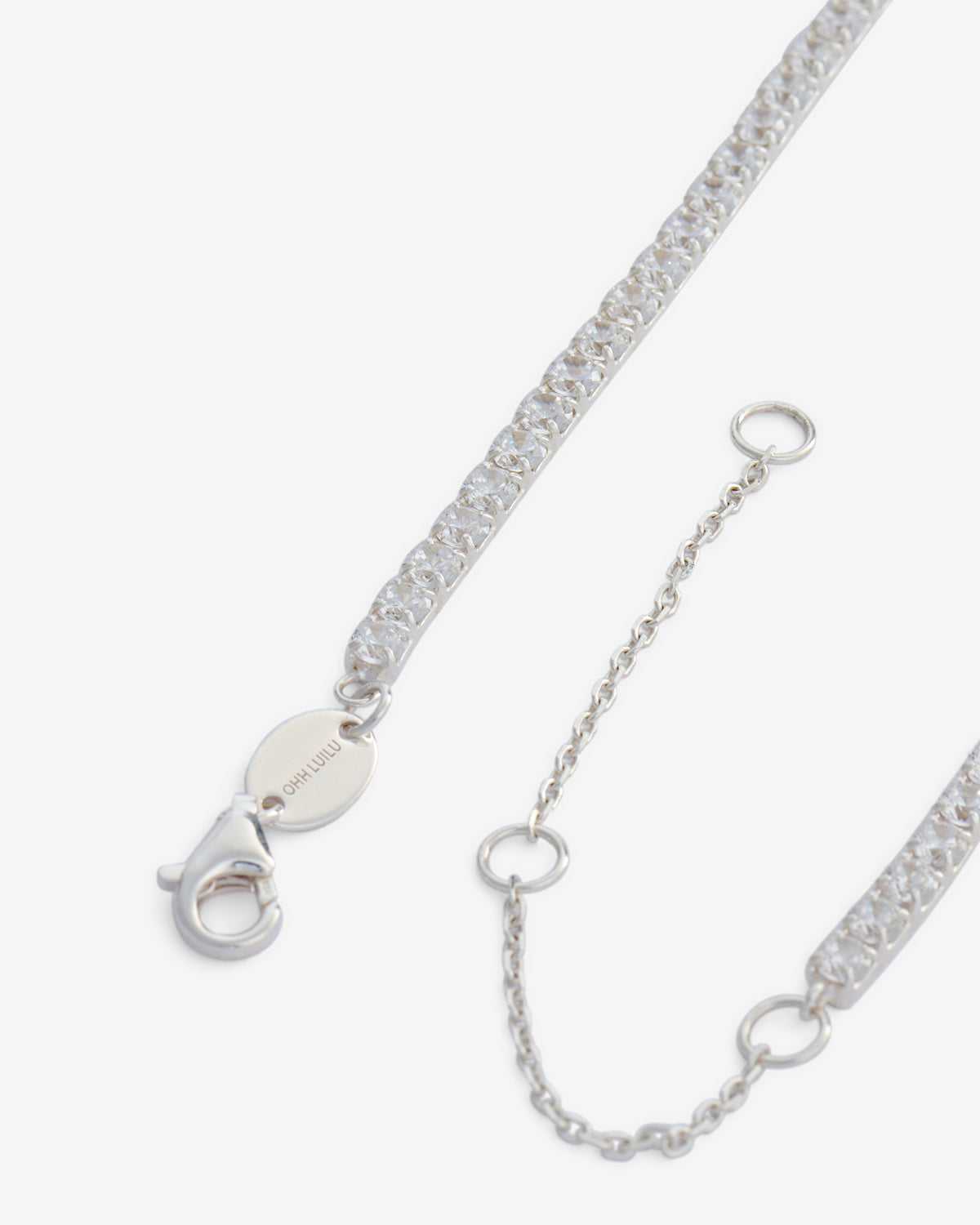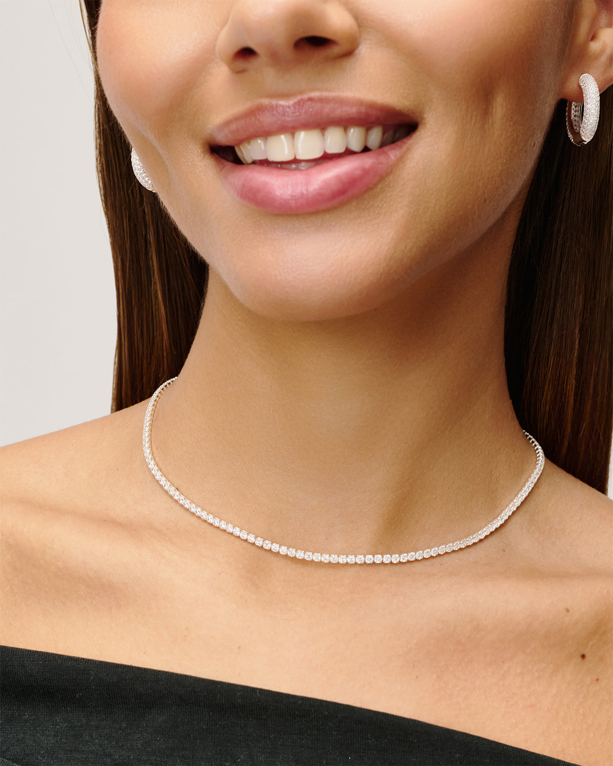 Erlebe zeitlose Eleganz mit dem beliebten Tennis Choker, einem wahren Klassiker, der in keiner Schmucksammlung fehlen sollte. Als Herzstück der Marke vereint das Statement-Piece Qualität, Stil und Raffinesse. Der Choker ist aus recyceltem Sterling Silber gefertigt und mit Zirkonia Steinen besetzt, die bei jedem Lichtstrahl ein atemberaubendes Funkeln erzeugen.
