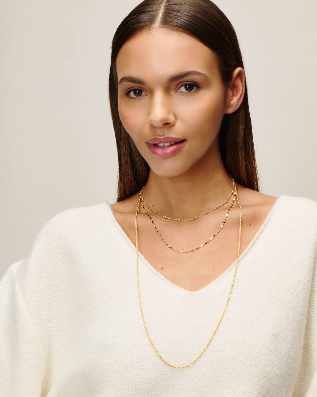 Golden, glänzend, glamourös! Die Mini Ruby Long in 18kt ist dein ultimativer Glow-Boost für jeden Look. Zart geflochten, super leicht und endlos kombinierbar – diese Kette bringt Sonnenstrahlen direkt auf dein Dekolleté. Ob solo getragen oder im Layering-Game: Mit ihr bist du immer on point und strahlst wie pures Gold.