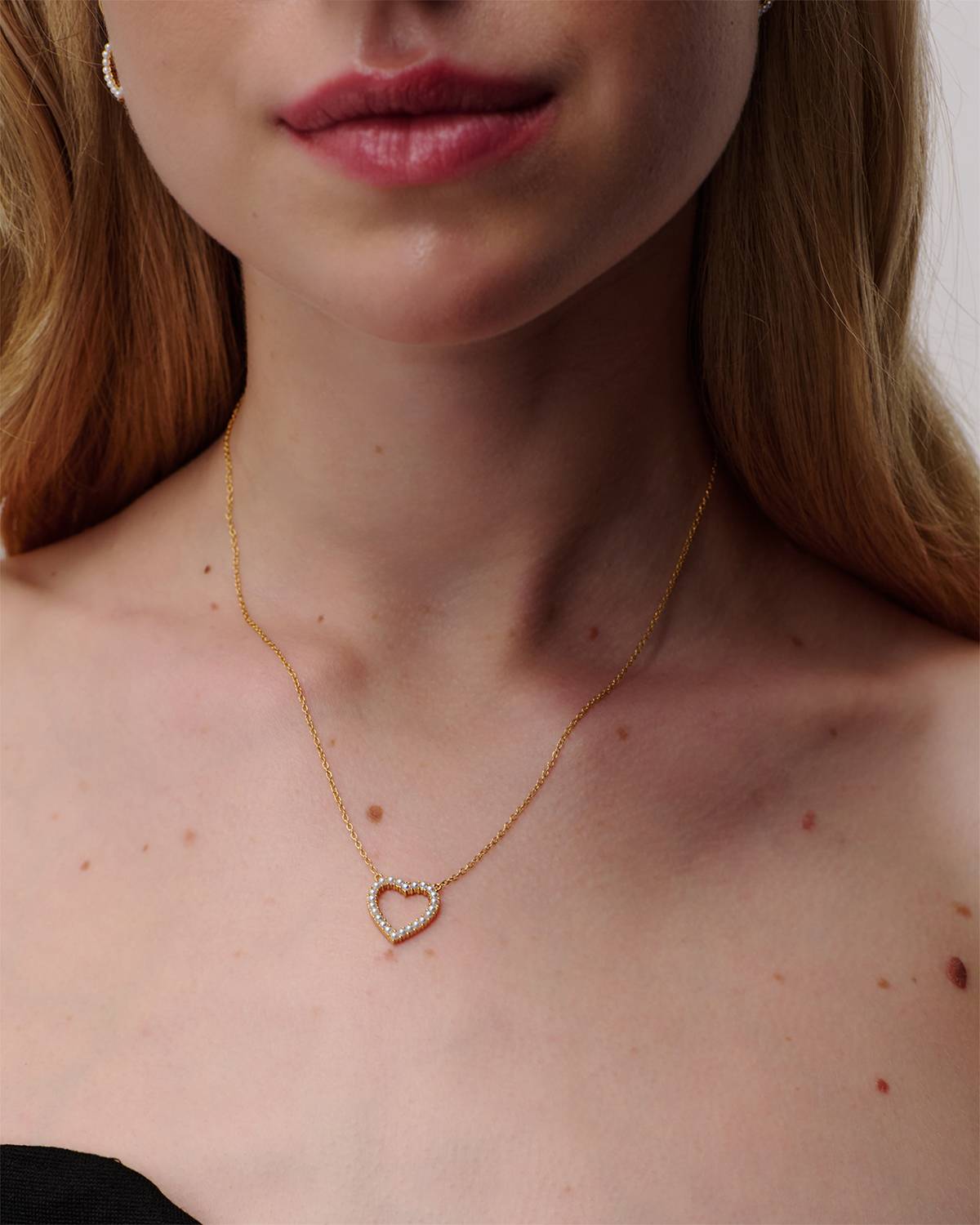 Zart und bedeutungsvoll – die Eternal Heart Kette aus 18kt vergoldetem Metall verführt mit einem filigranen Herzanhänger aus weißen Perlen. Ein Schmuckstück, das Wärme und Eleganz vereint – perfekt für jeden Moment, der zählt.