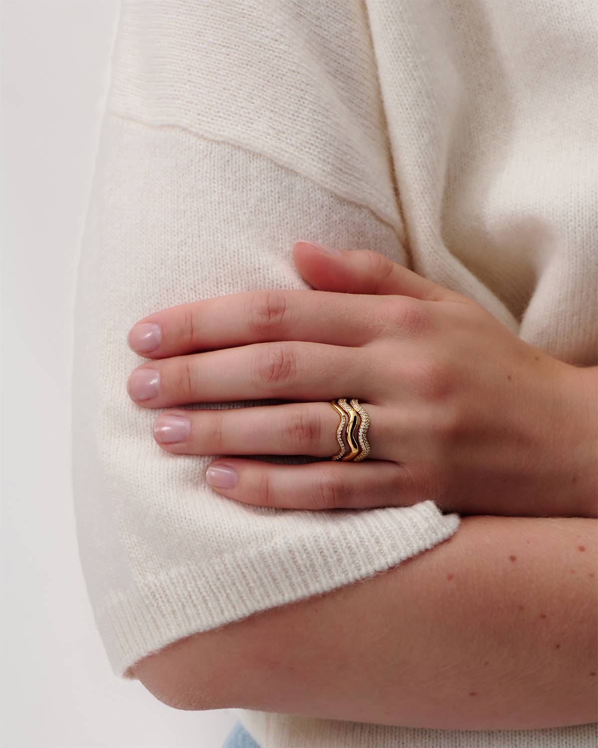 Mit Layla bringst du Abwechslung ins Ring-Stacking. Der Ring aus 18kt Vergoldung mit White Zirconia überzeugt durch seine geschwungene Form und wird so zum Hingucker, ohne zu laut zu wirken. Solo getragen dezent, in Kombination mit anderen Ringen edgy und stylish – Layla passt sich jedem Look spielerisch an.