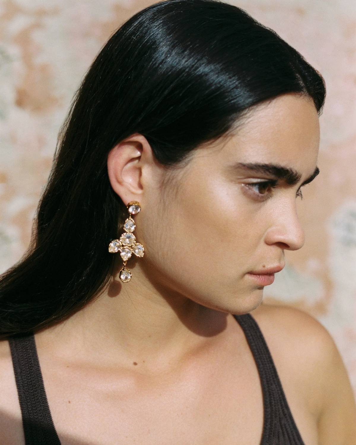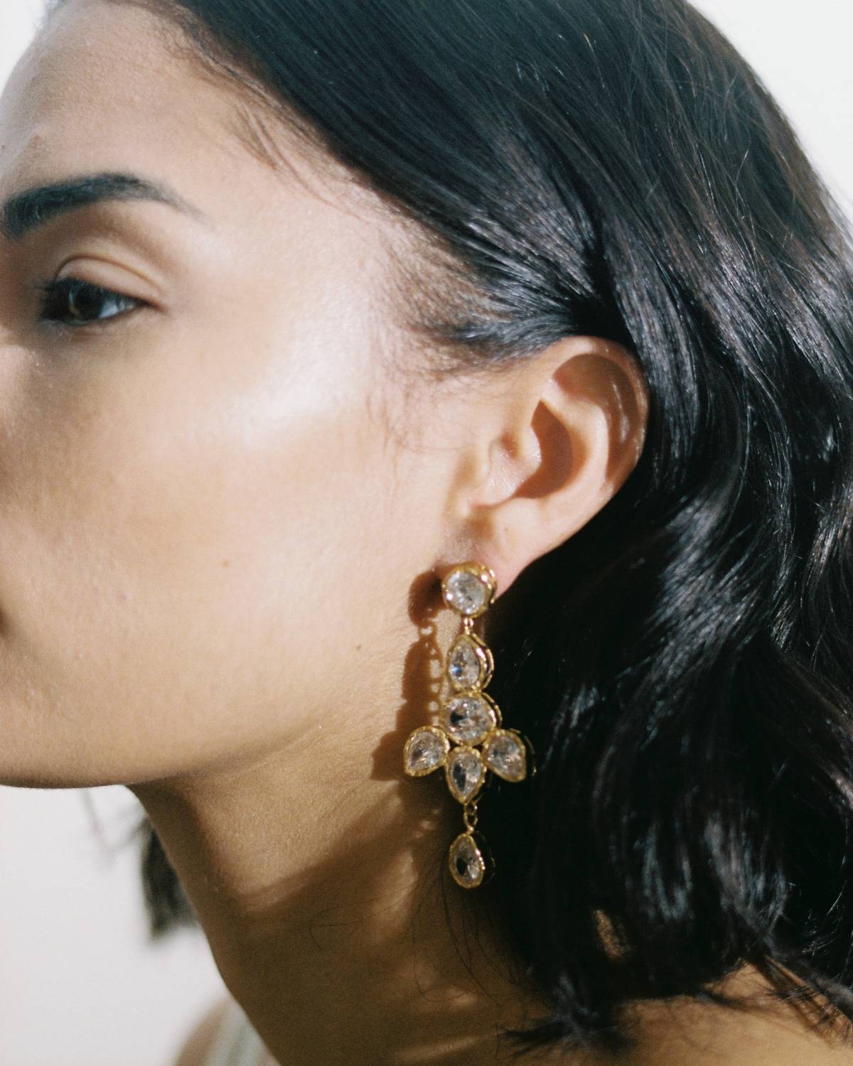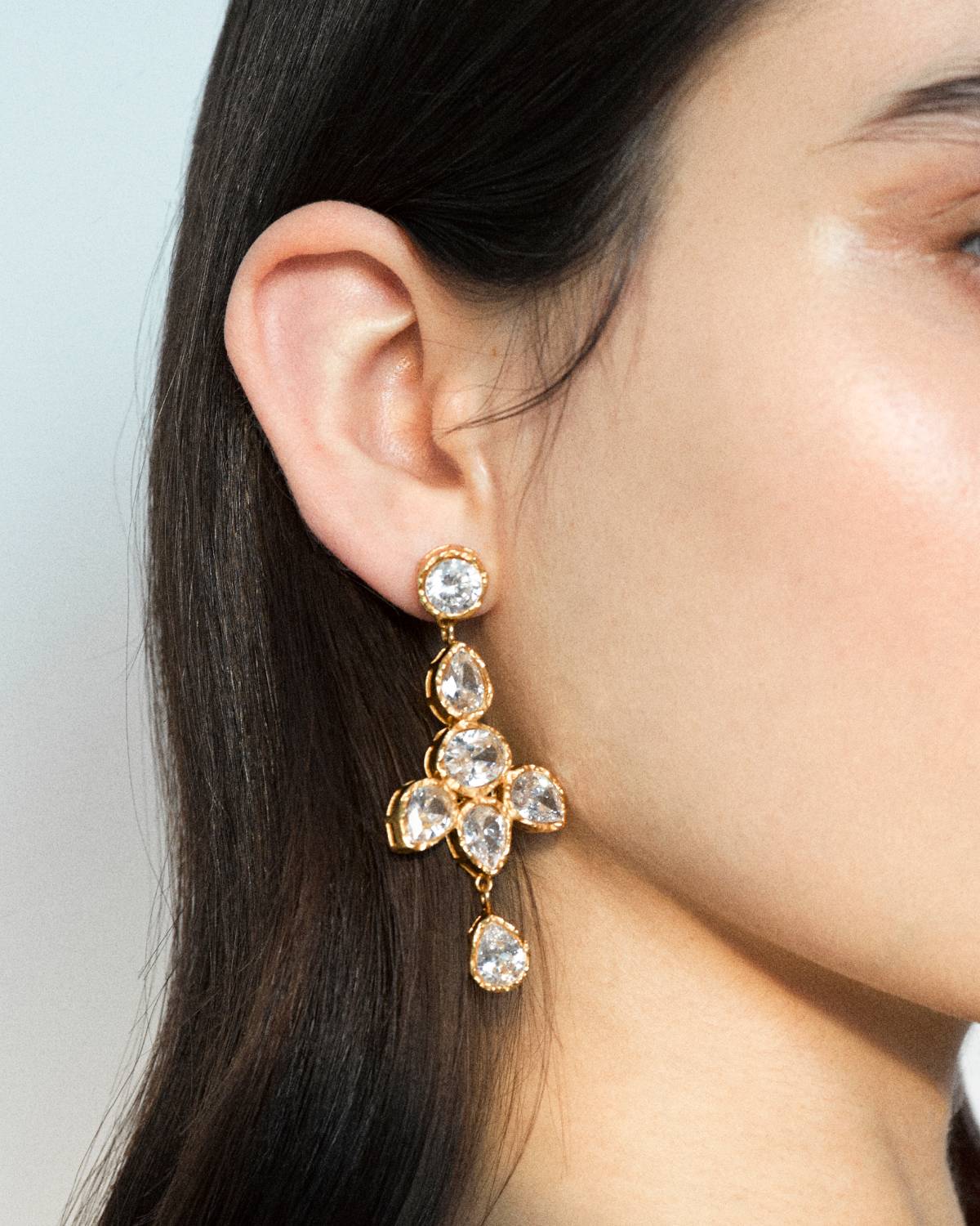 Engelsgleicher Glam – die Serafina Earrings funkeln mit klaren Kristallen in Tropfen- und Rundformen, kunstvoll in 22kt Gold eingefasst. Ein eleganter Mix aus Drama und Leichtigkeit, der jedes Outfit sofort zum Strahlen bringt. Ideal für Abende, an denen du im Mittelpunkt stehen willst.
