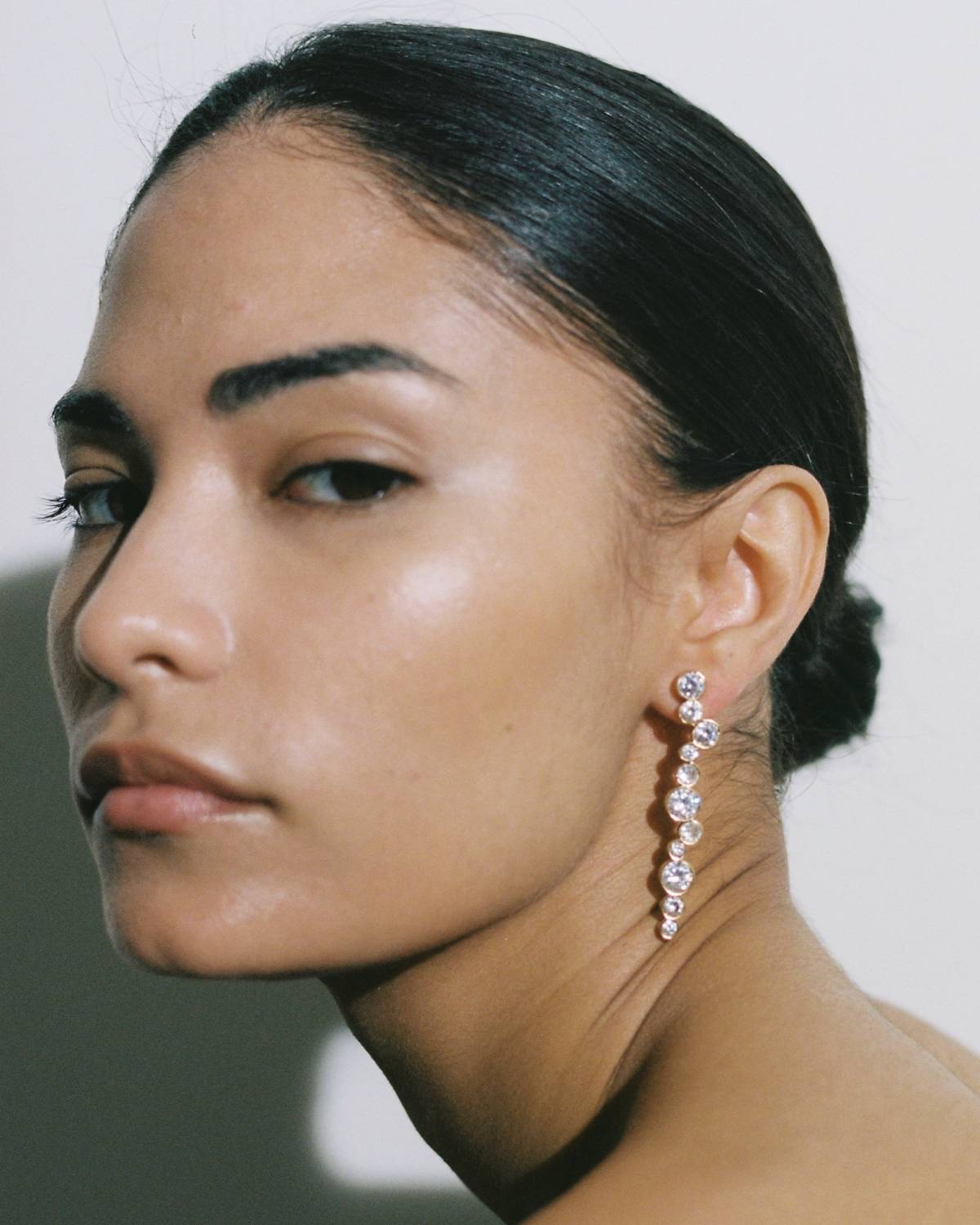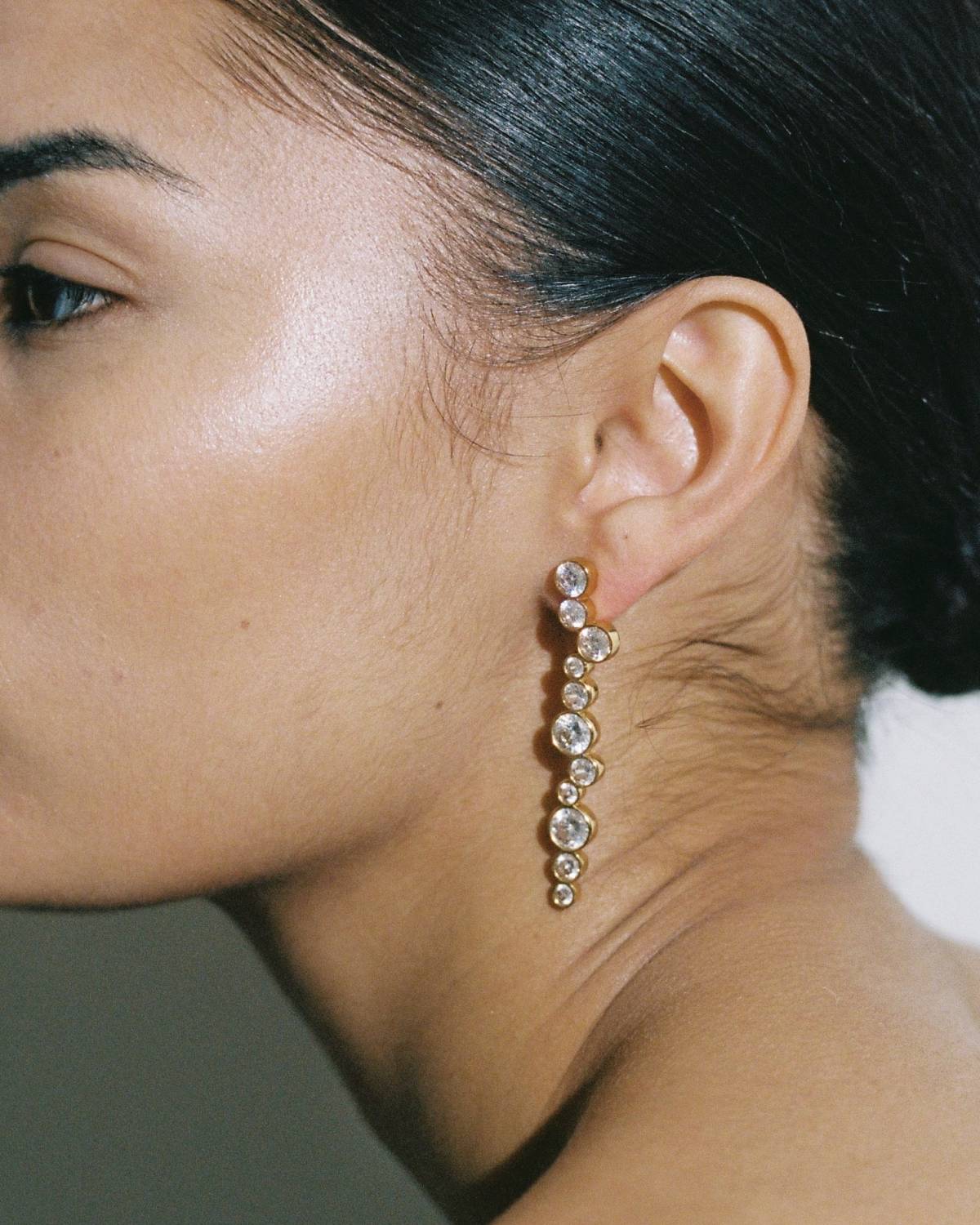 Die Tier Earrings von Shyla London sind funkelnde Kunstwerke. Unterschiedlich große Kristalle reihen sich in edler 22kt Vergoldung aneinander und zaubern ein dynamisches Glitzerspiel. Leicht, modern und absolut elegant – das Statement-Piece für alle, die Glanz lieben.