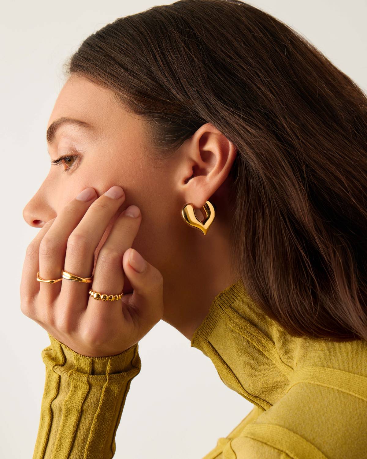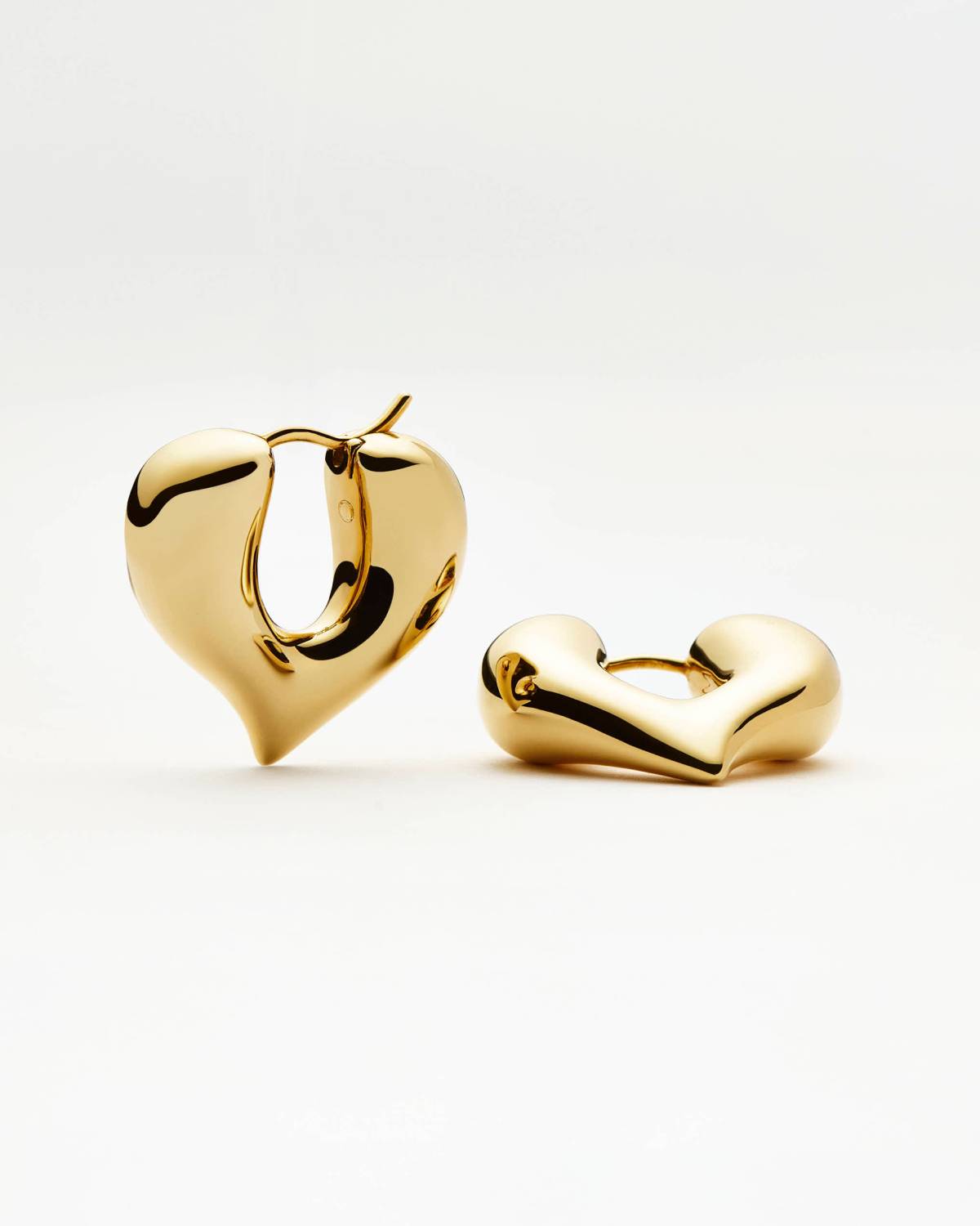 Molten Heart Medium Hoop Earrings bringen Heart-Vibes mit extra Wow: Die voluminösen Creolen in Herzform wirken wie flüssig gegossen und glänzen dank 18kt Gold Vermeil ultra smooth. Der skulpturale Look zieht sofort Blicke an und macht selbst schlichte Outfits spannender. Ein modernes Statement für jeden Tag, das deinem Styling einen coolen Twist und viel Shine gibt.