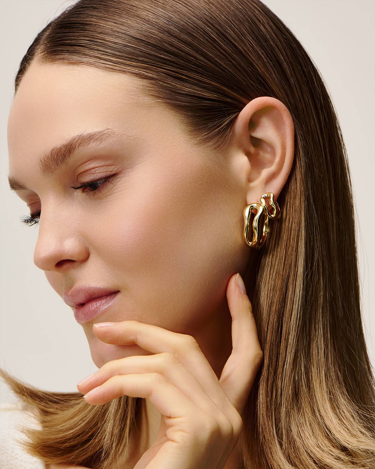 Die Melina Sculpted Medium Ohrringe von Pompidou zeigen, wie modern geformte Eleganz funkeln kann. Ihre sanft geschwungenen Linien wirken wie kunstvoll modelliert – weich, sinnlich und voller Bewegung. Das 18-Karat-Goldplating bringt einen warmen Glanz, der Tiefe und Ausdruck verleiht. Ein Design mit starker Persönlichkeit: klassisch inspiriert, kreativ interpretiert und wunderbar zeitgemäß.
