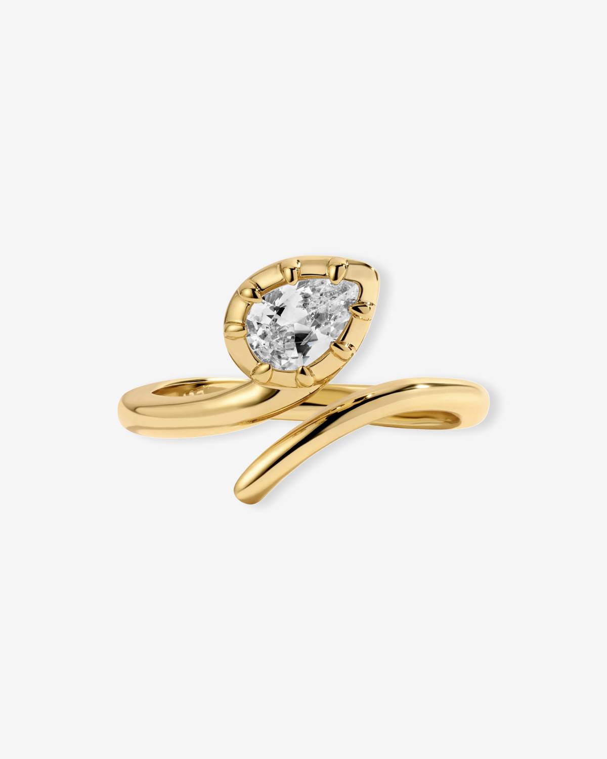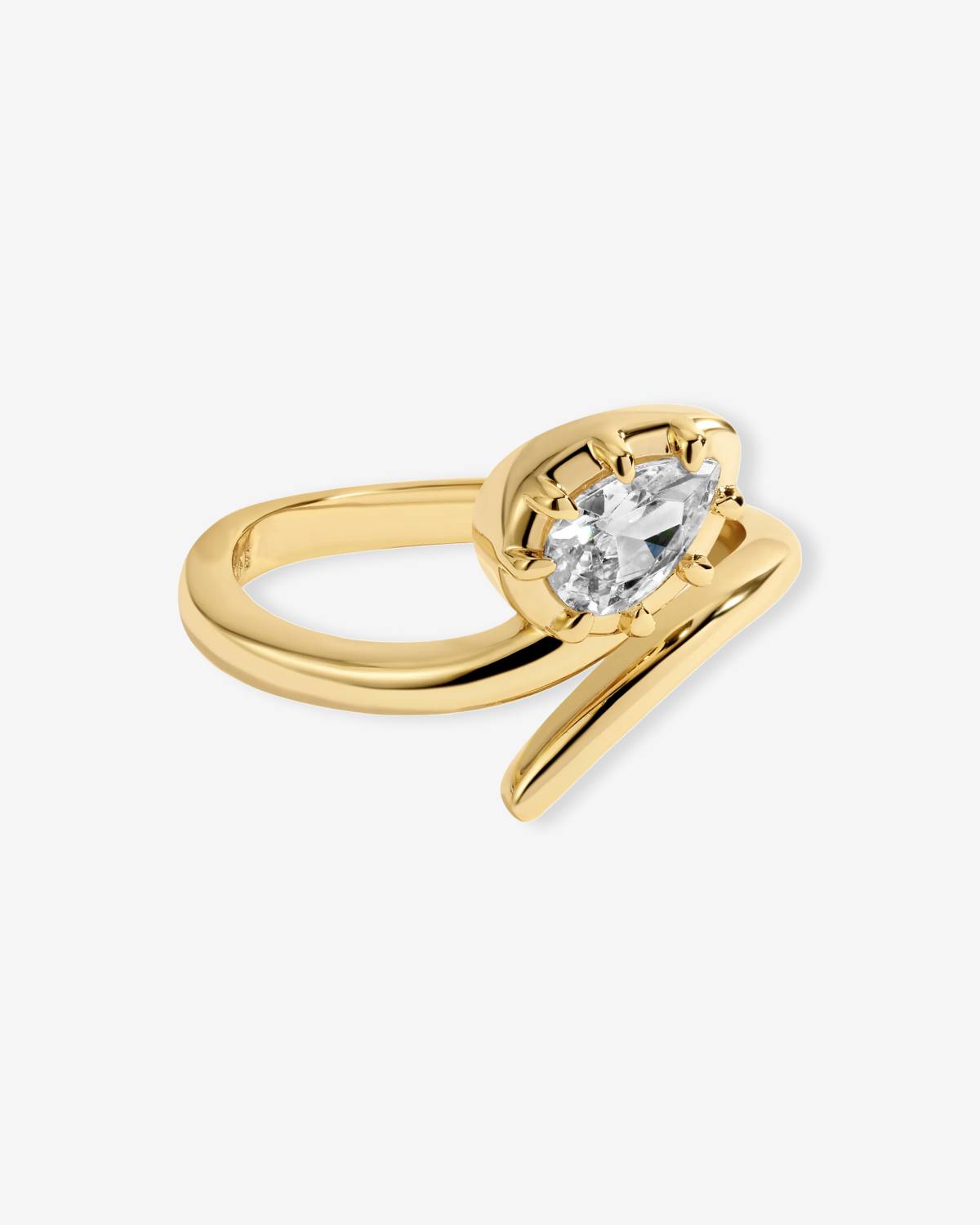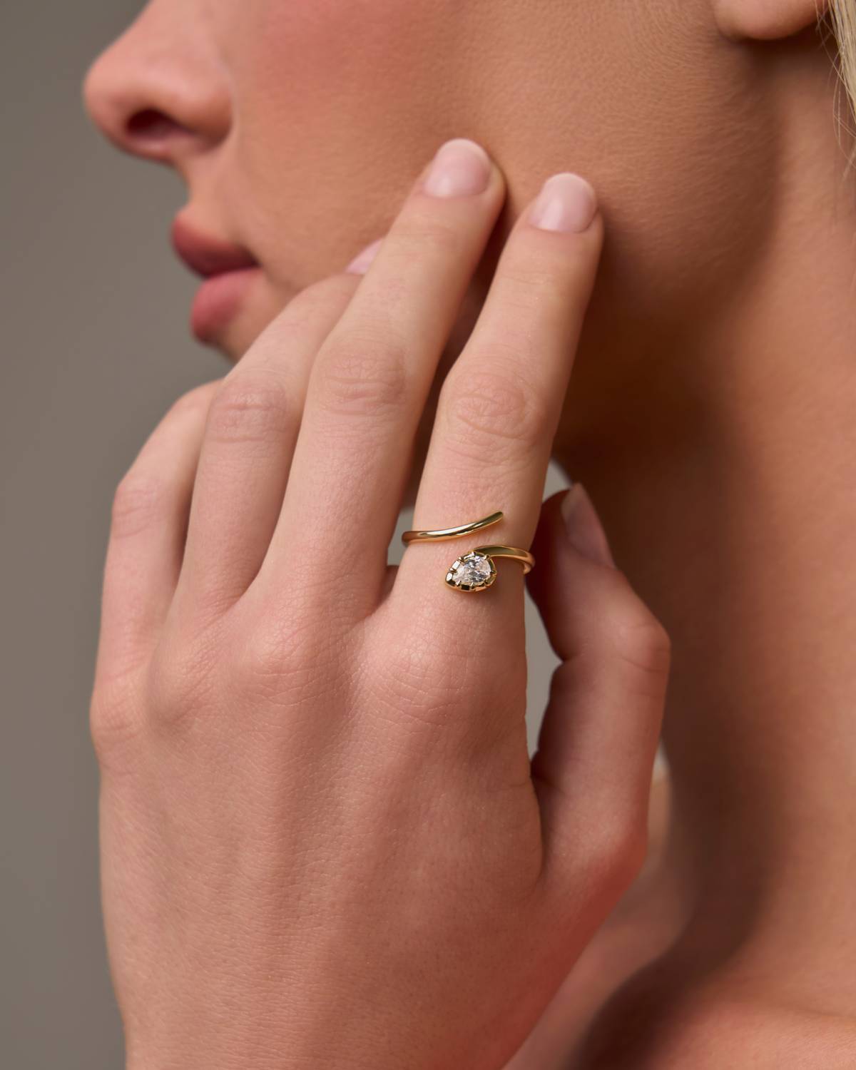 Der Drew Ring besticht durch seine fließende, offene Form und einen markanten Blickfang. In warmem 14kt vergoldetem Finish windet sich die Ringschiene elegant um einen tropfenförmig geschliffenen Zirkonia, der durch seine Fassung besonders hervorgehoben wird. Die organische Linienführung verleiht dem Design Bewegung und Leichtigkeit – ein moderner Ring mit ausdrucksstarker Eleganz.