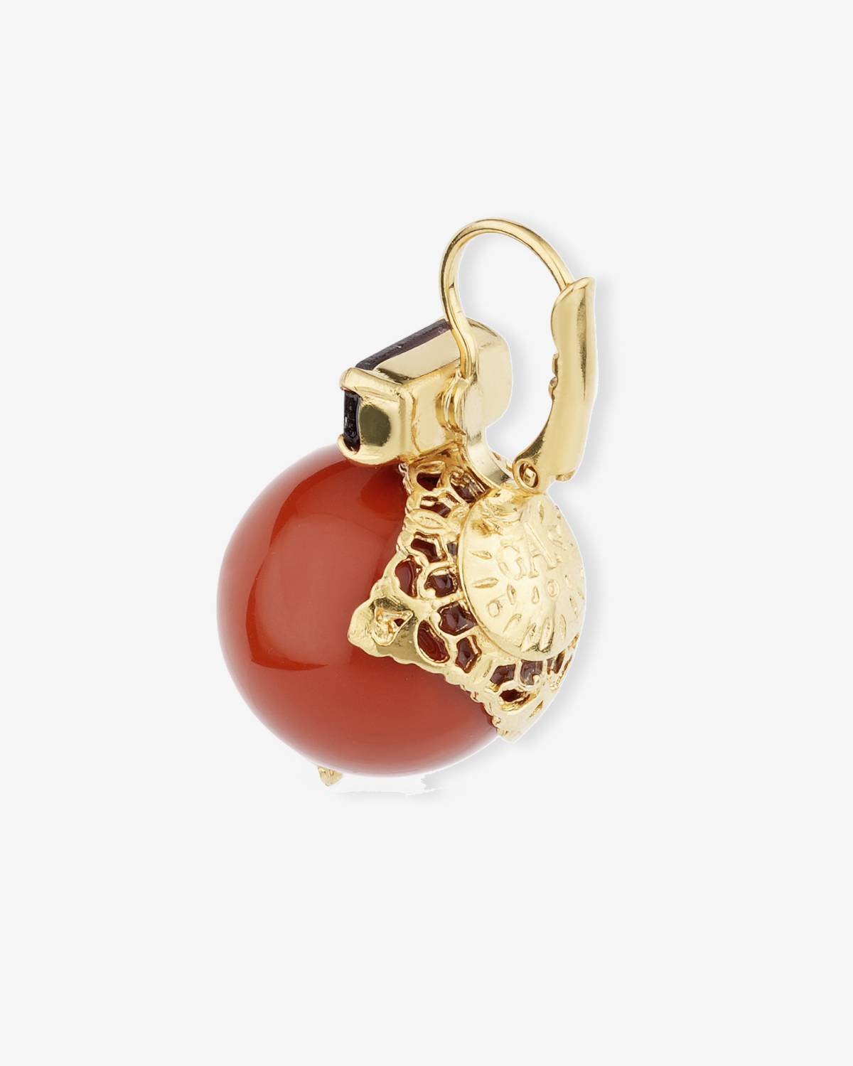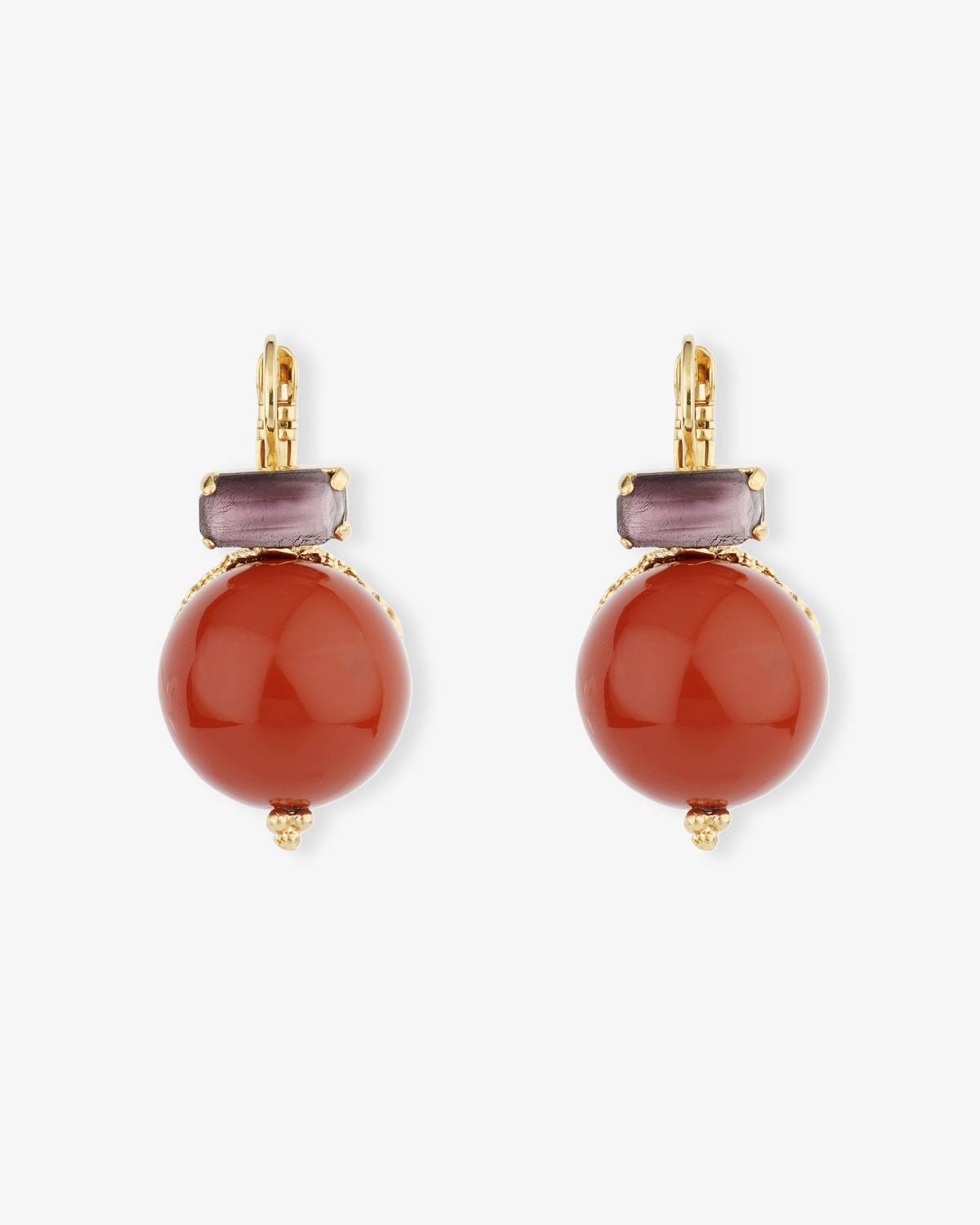The Decalcia Earrings are pure color magic! Their radiant red-brown spheres contrast with violet stones in geometric settings – an exciting duo of warmth and coolness. 18ct gold plating adds a touch of luxury that catches every glimmer of light. A perfect blend of retro flair and modern statement.