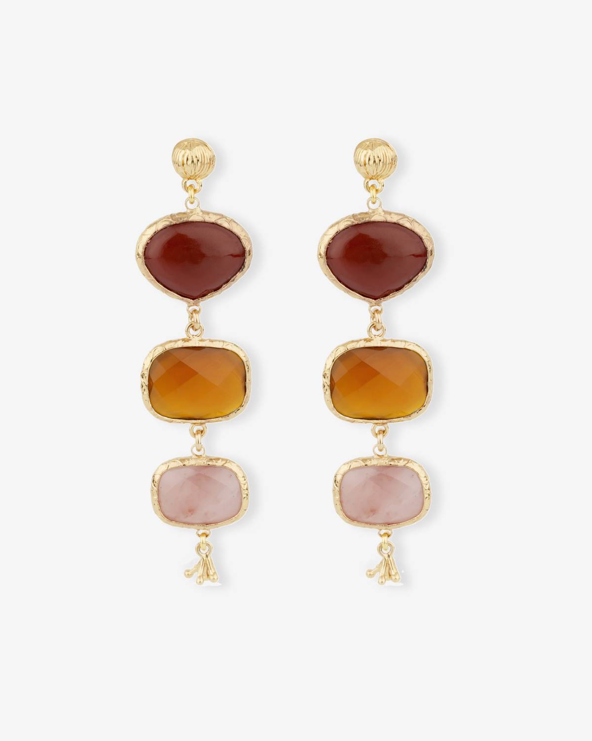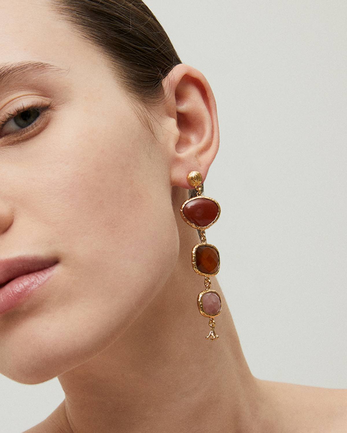 The Silene Earrings are a sunny play of color featuring Carnelian and Guava Quartz, set in 18ct gold-plated metal. The warm red and blush tones shimmer like a sunset in motion – elegant, playful and full of character. Jewelry that radiates both energy and charm.