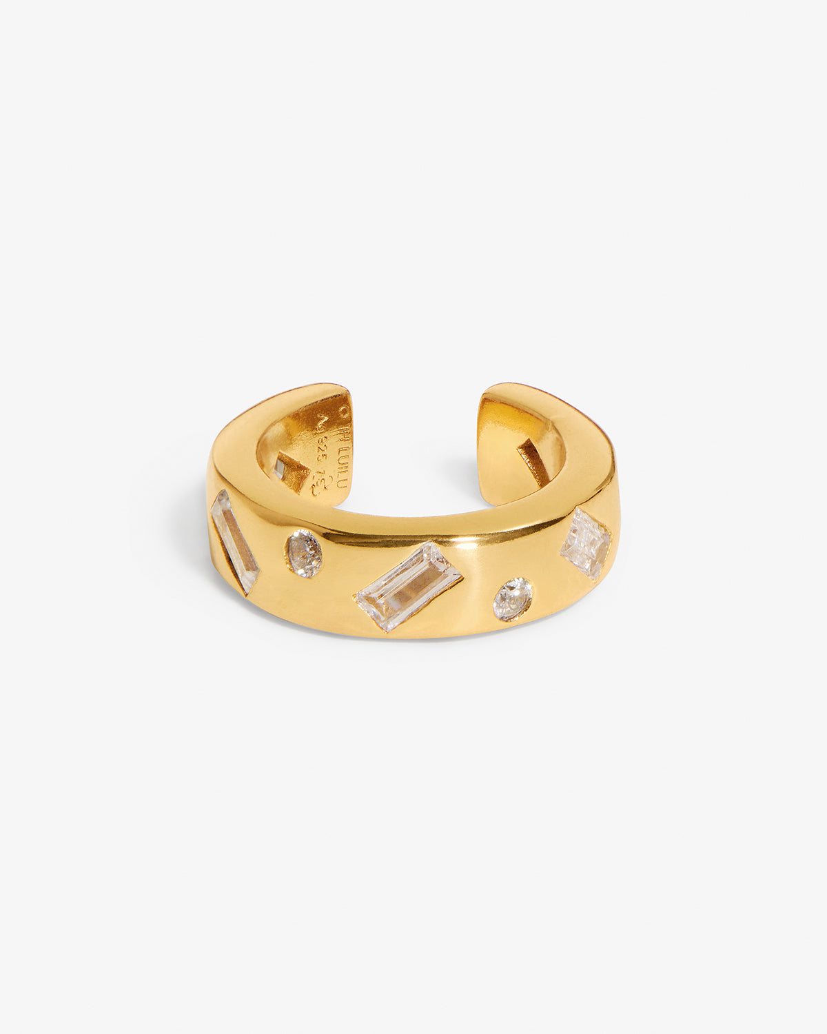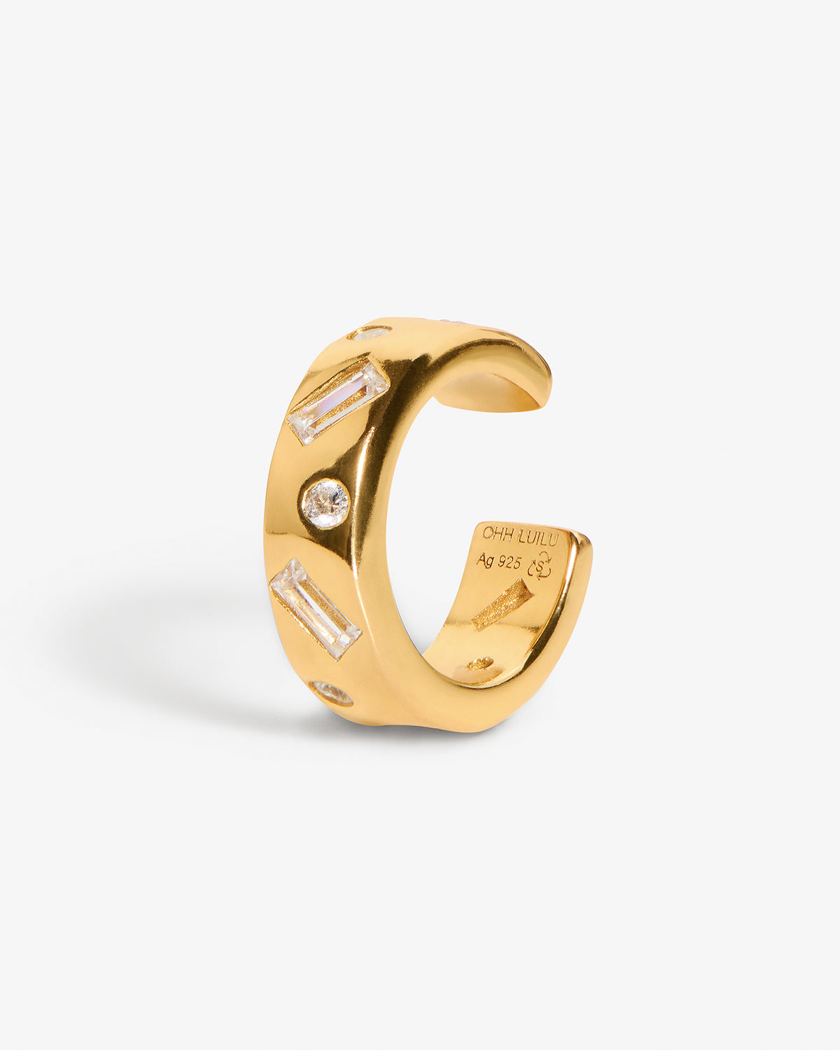 The Dazzle Cuff from Ohh Luilu adds an elegant sparkle to your jewelry collection. Made from recycled sterling silver and 18ct gold plating, this ear cuff stands out with its rectangular baguette zirconia, which sparkle in a bold design. Whether for everyday wear or special occasions, the Dazzle Cuff is the perfect companion to add a radiant highlight to any look.