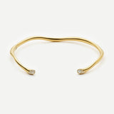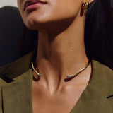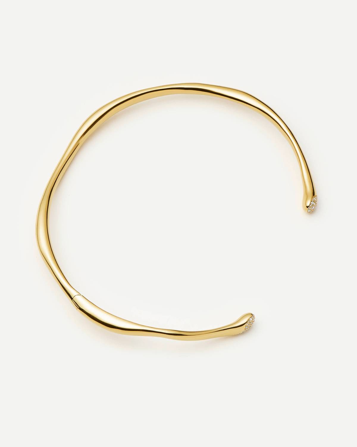 Minimalism meets glamour: The Molten Snow Torque Necklace stuns with sleek, flowing lines and sparkling stone details at the ends. Crafted in 18kt gold plating, its open design makes it easy to wear while adding modern elegance to every outfit.