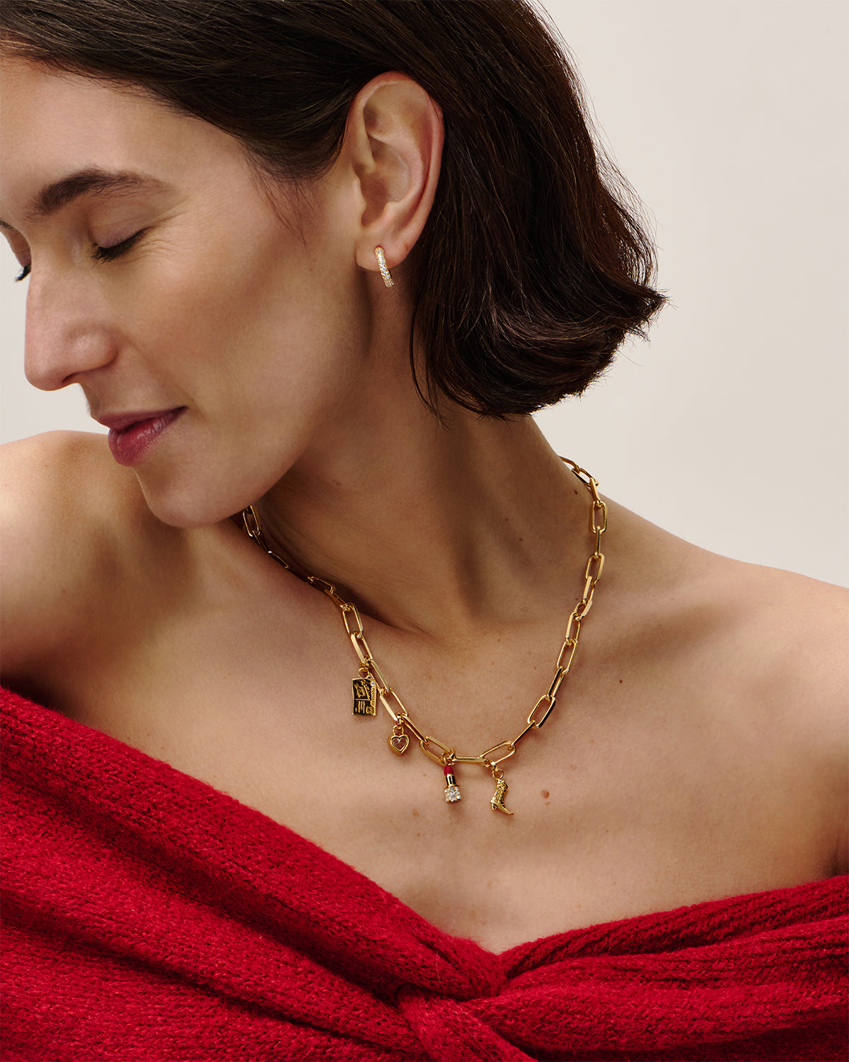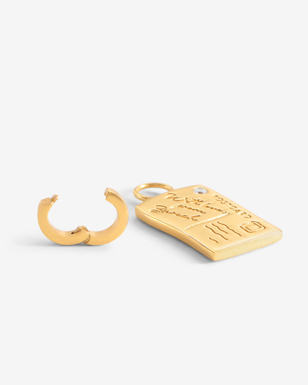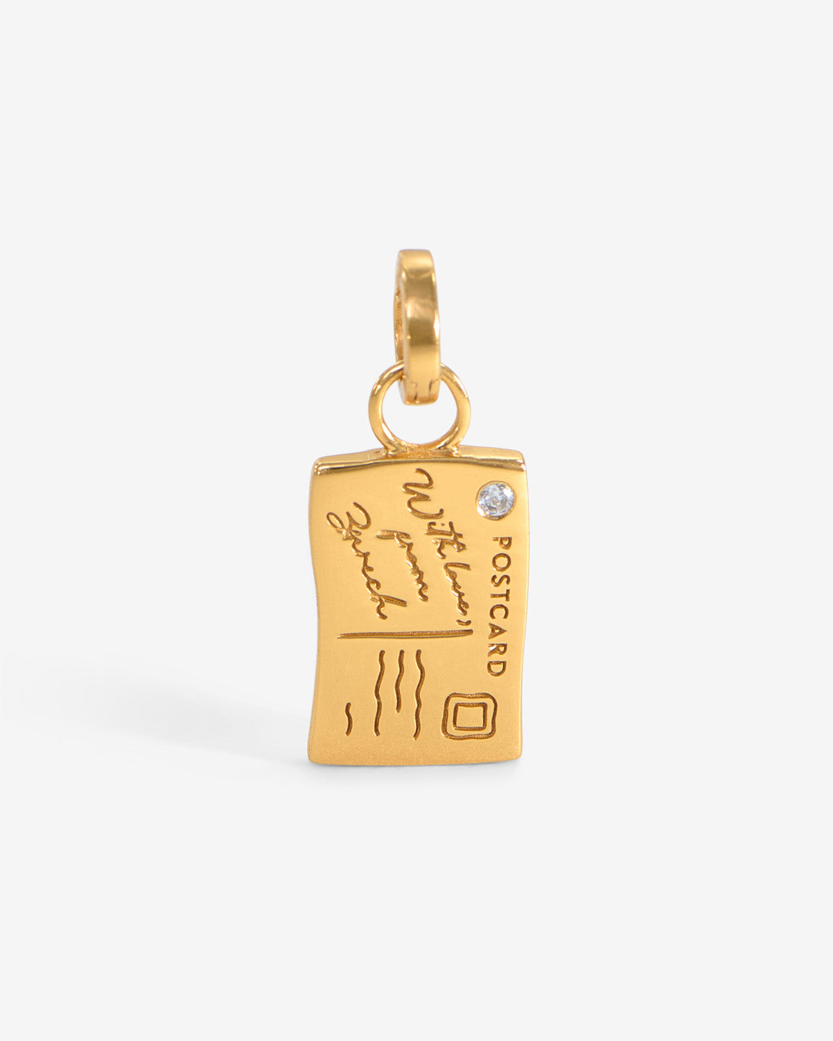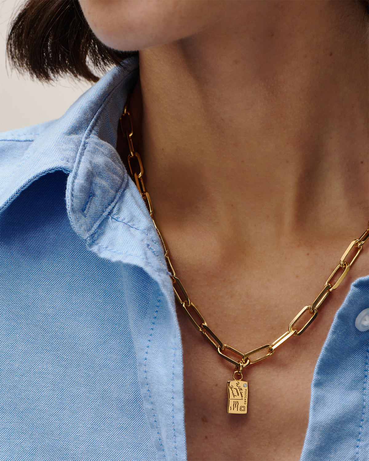 The With Love from Zurich necklace charm captures a quiet sense of closeness and emotion. Its rectangular shape feels intentionally raw and modern, while the delicate engraving adds a personal, almost handwritten touch. Finished in 18ct gold plating, it balances soft shine with meaning – understated, elegant and unmistakably Ohh Luilu.