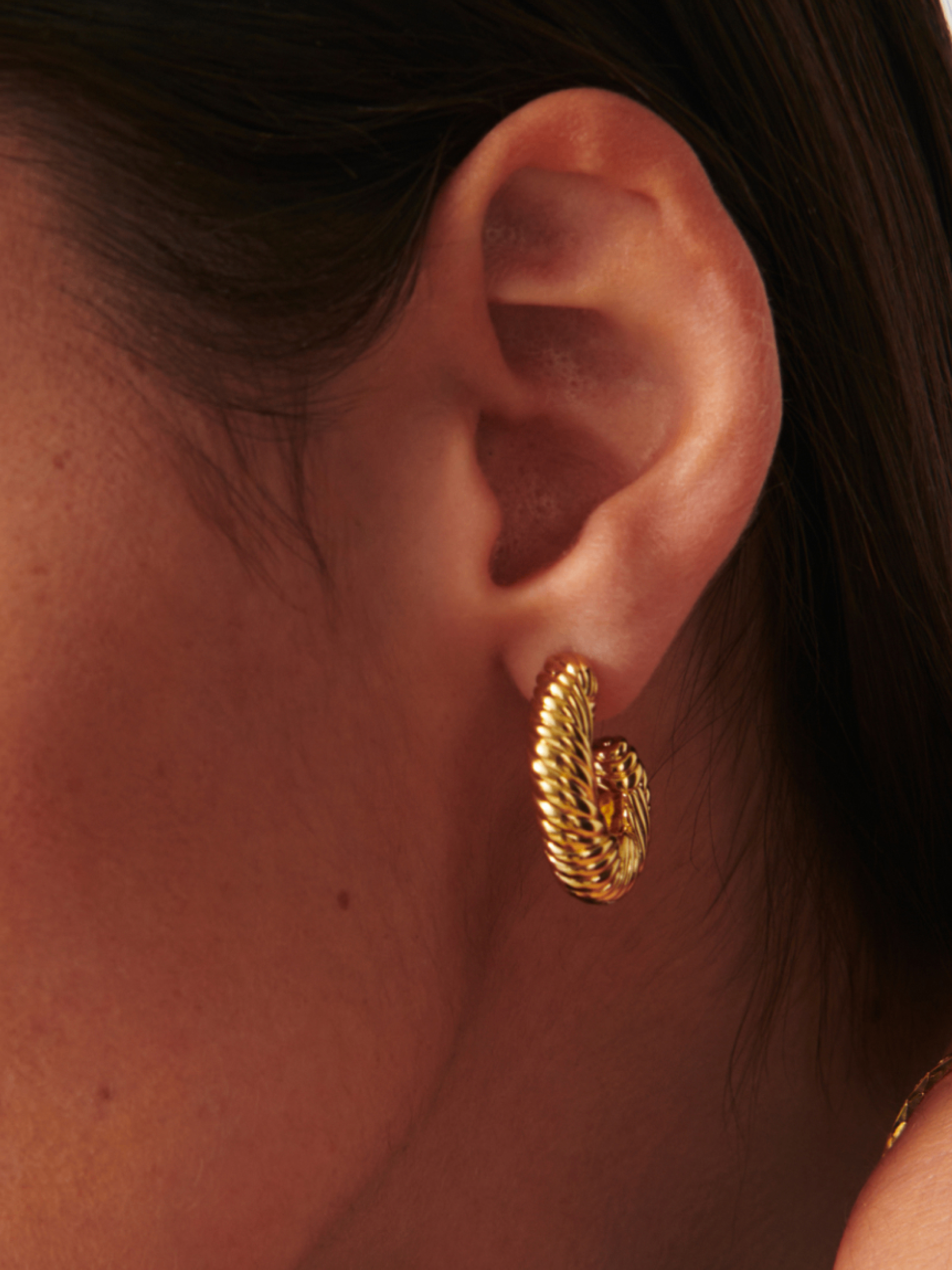 A classic earring that you will never want to take off again. The Gold Chubby Huggies with a wave-like structure make a unique impression. They are made from 18kt gold-plated sterling silver.