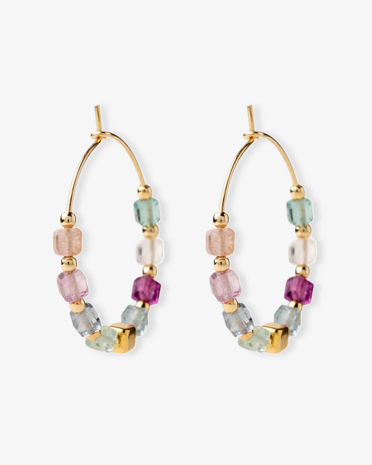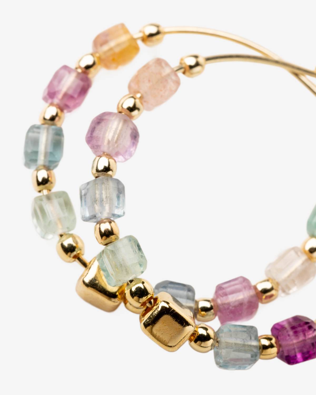 Bold hoops, soft colors. The Fluorite Hoops by Alisia combine faceted fluorite stones in delicate pastel tones with radiant 24ct gold plating. Each stone has its own vibe, together creating a modern, confident look with fresh glow. These gold-plated hoops are your statement for color, energy and effortless luxury.