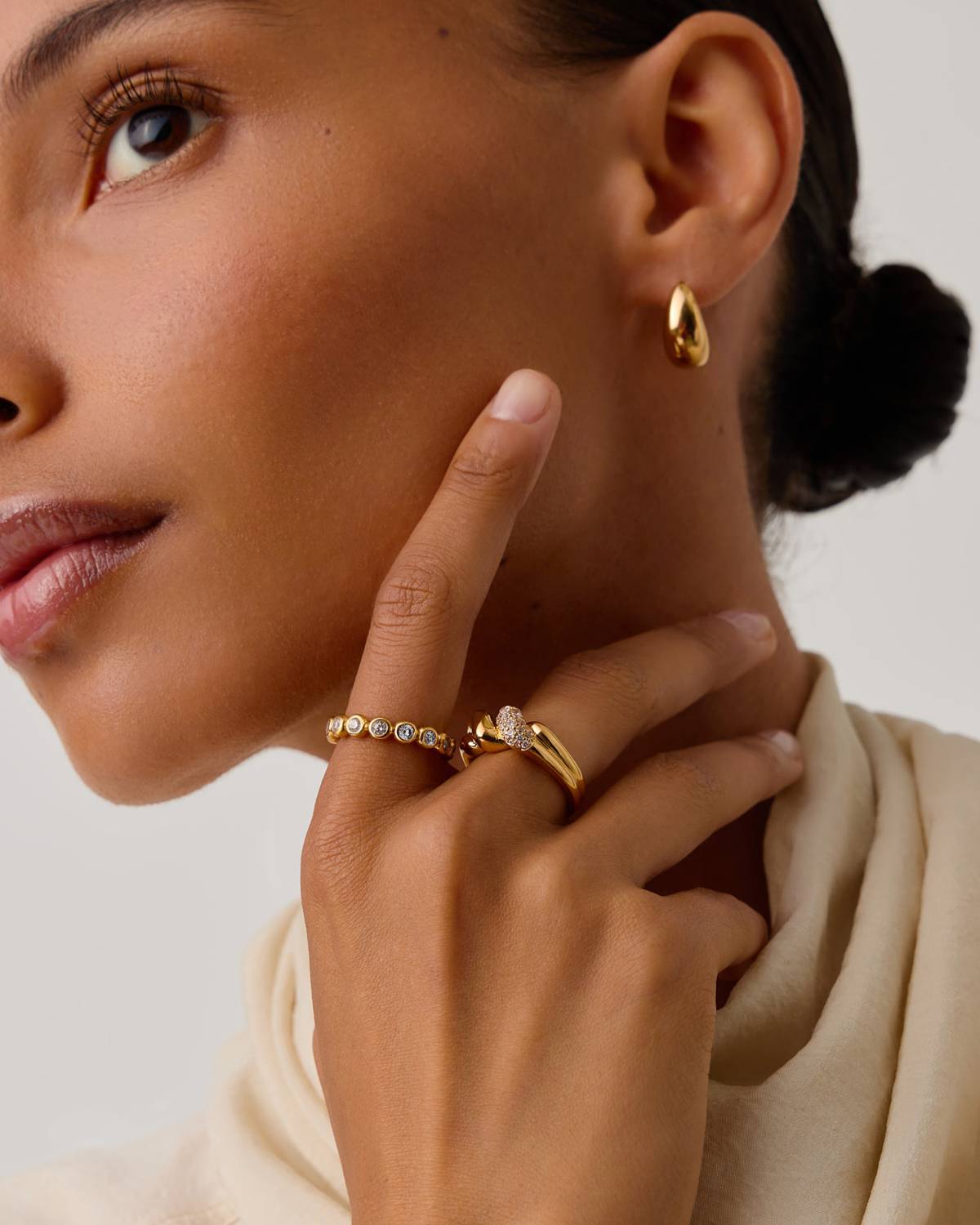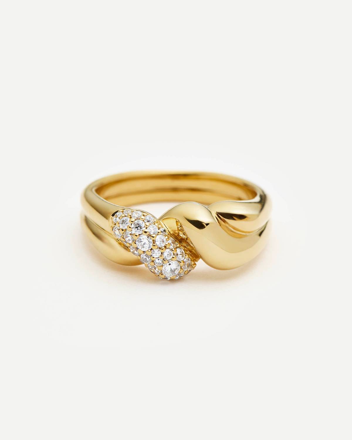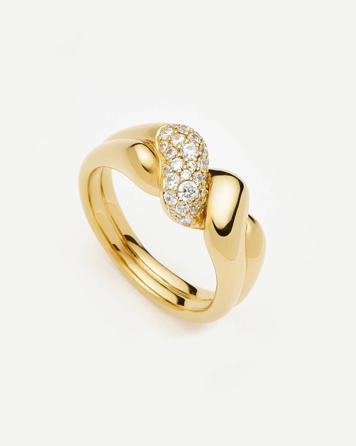 A ring that unites design artistry and glamour: two curved elements merge into a chic silhouette. The 18kt gold plating highlights the sparkling stones, making it a timeless yet bold eye-catcher.