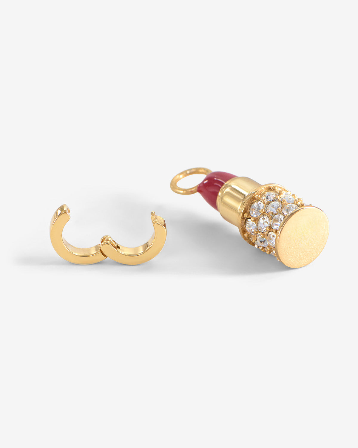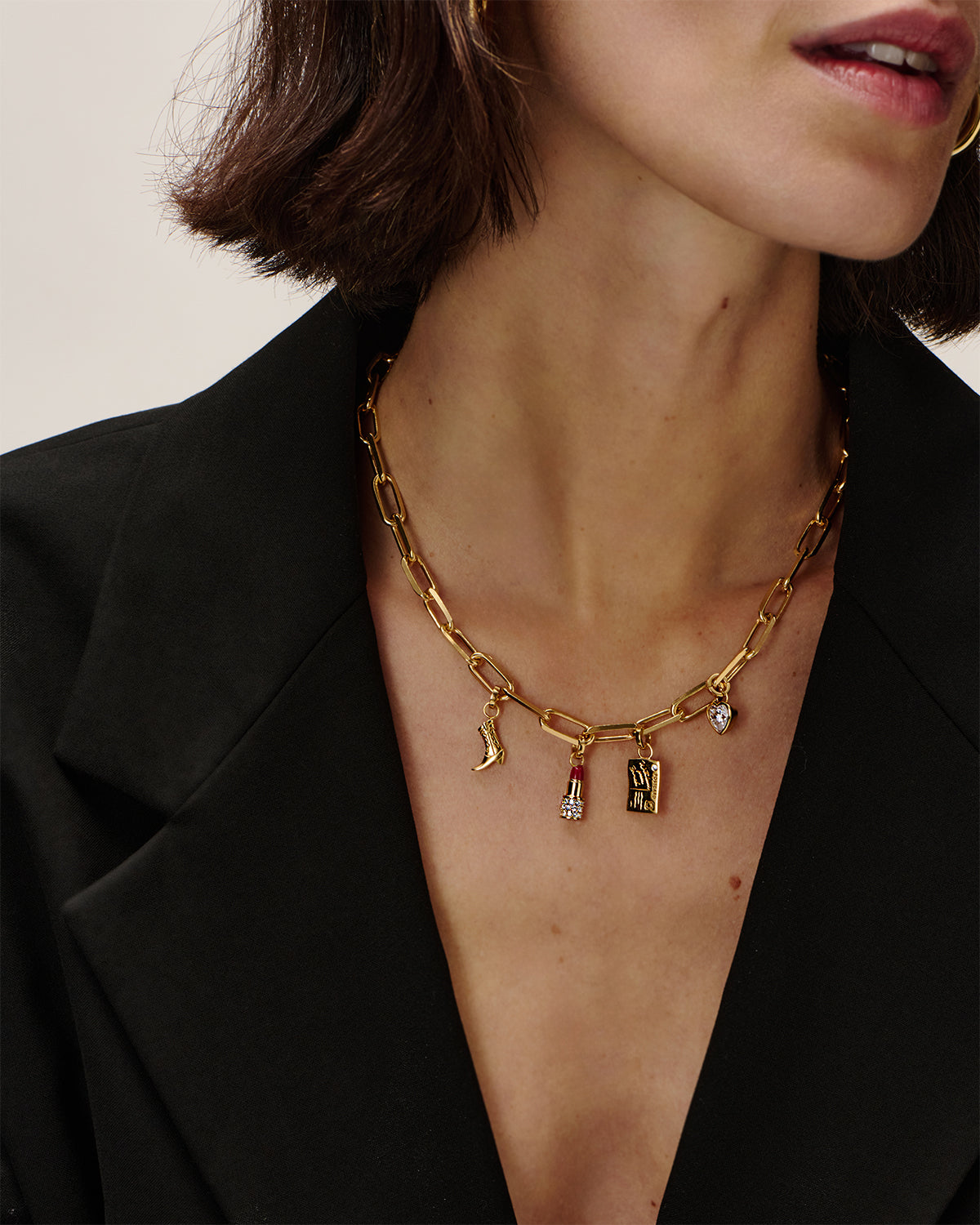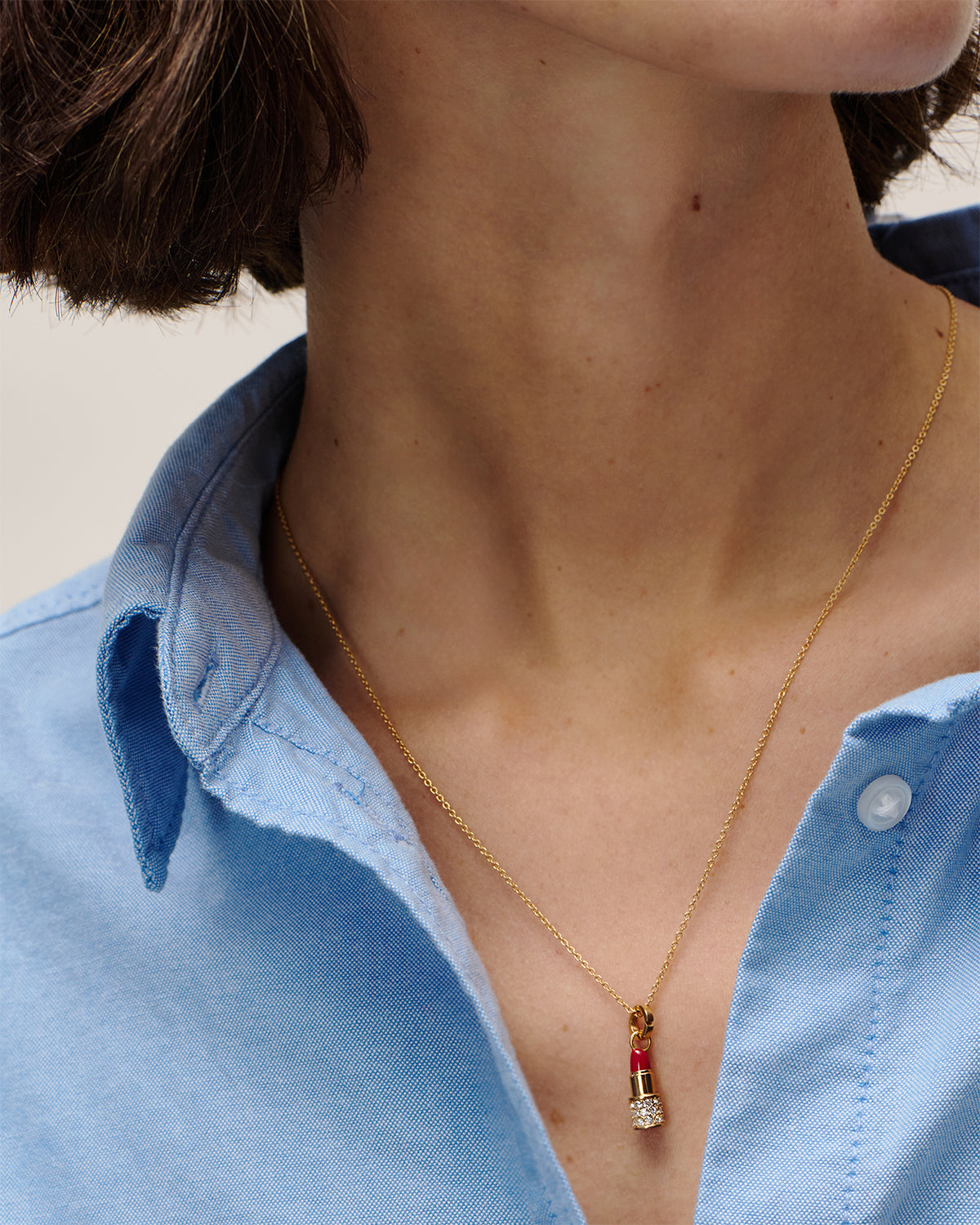 The Never Without necklace charm is your everyday mini lipstick moment. 18ct gold plated and designed in a sleek bar shape, it features a rich red core inspired by beauty essentials, finished with a rectangular pavé of sparkling zirconia. Playful, modern and slightly glamorous – subtle on its own or bold in a layered look.