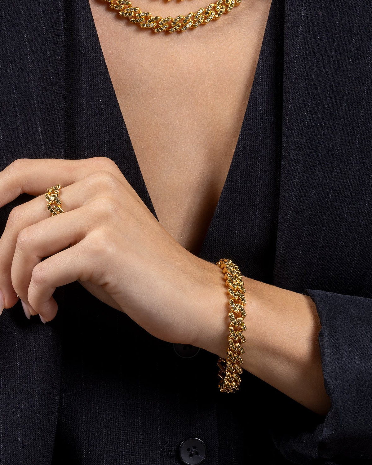 Ce bracelet tendance de Crystal Haze, serti de nombreuses pierres de zircone et scintille jour et nuit, prouve que non seulement le dos mais aussi les poignets peuvent ravir. Le design tendance et épais et le placage en or 18 carats s'adaptent également parfaitement au poignet nu et subliment aussi bien les robes de cocktail élégantes que le rock club chic.