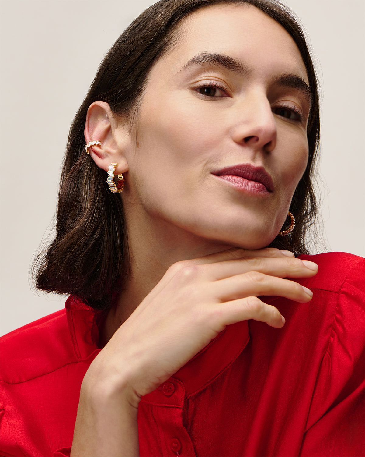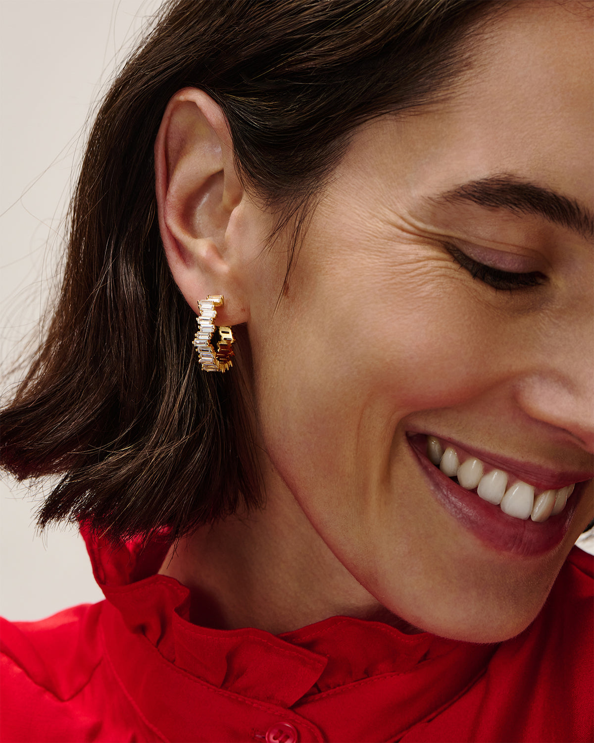 Die Baguette Hoops Ohrringe sind ein wahrer Blickfang, perfekt für jeden Anlass. Diese eleganten Creolen aus 18kt vergoldetem, recyceltem Sterlingsilber sind mit funkelnden Zirkonia besetzt, die das Licht wunderschön reflektieren. Mit 8 g pro Ohrring sind sie angenehm zu tragen und verleihen jedem Outfit Glamour und Eleganz. Diese zeitlosen Schmuckstücke sind ein Must-have für jede Schmucksammlung.