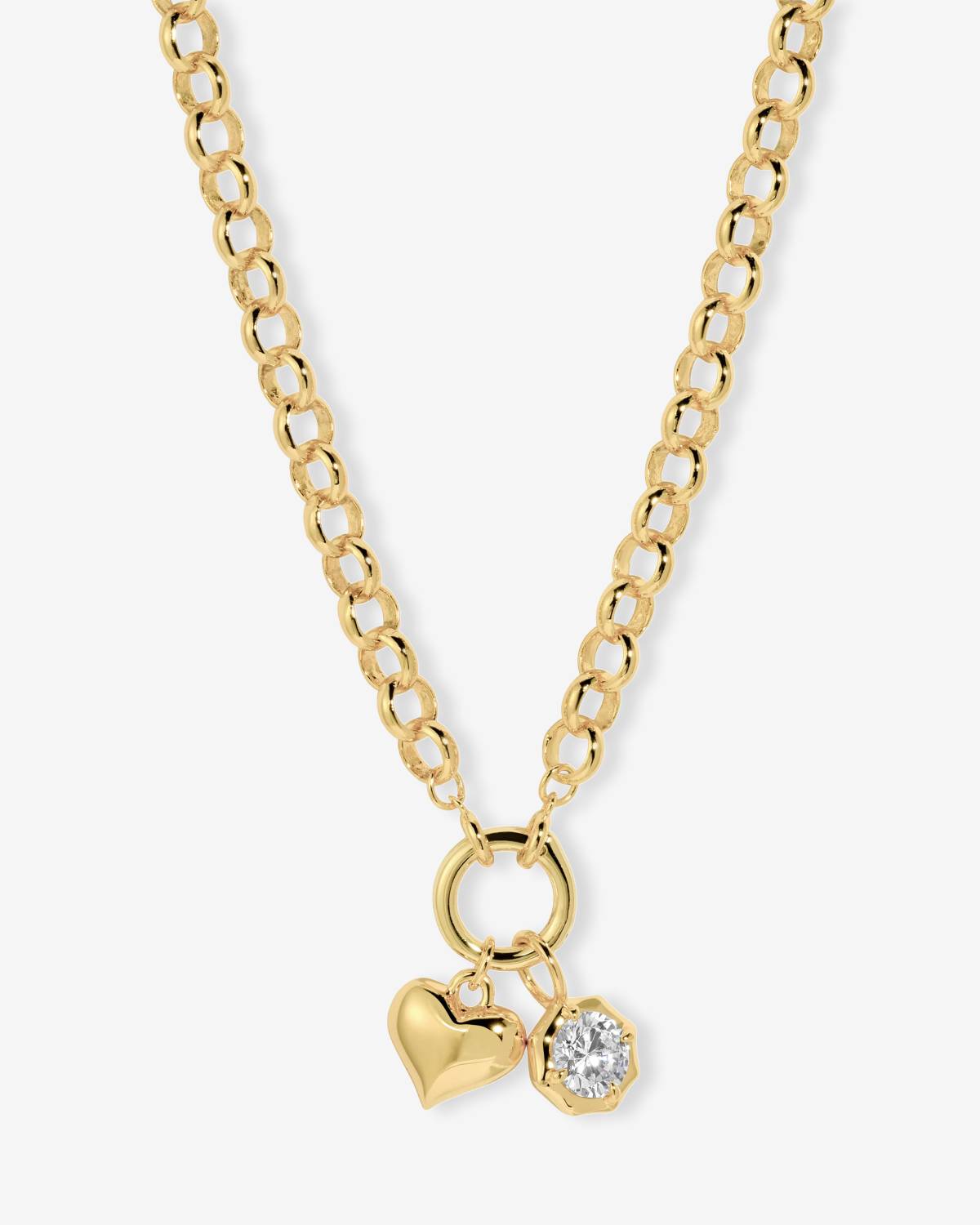 Die Amara Charm Chain vereint Gefühl und Glanz auf besonders schöne Weise. An der 14kt vergoldeten Gliederkette hängen ein zartes Herz und ein runder Charm mit funkelndem Zirkonia, die bei jeder Bewegung sanft schimmern. Die Kombination aus klaren Formen und verspielten Details verleiht dem Schmuckstück eine moderne Eleganz mit emotionalem Twist – ideal für Looks mit Persönlichkeit.