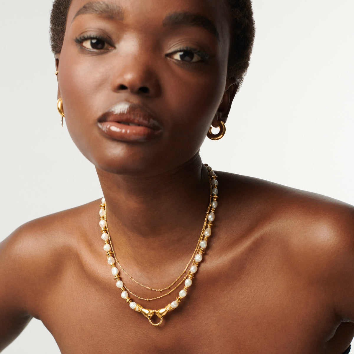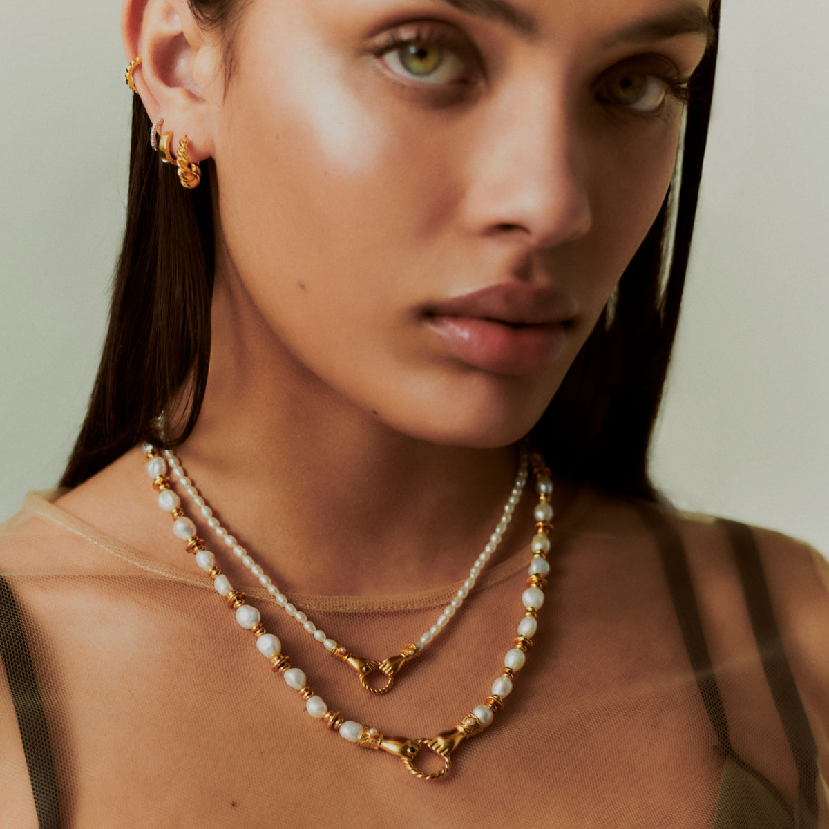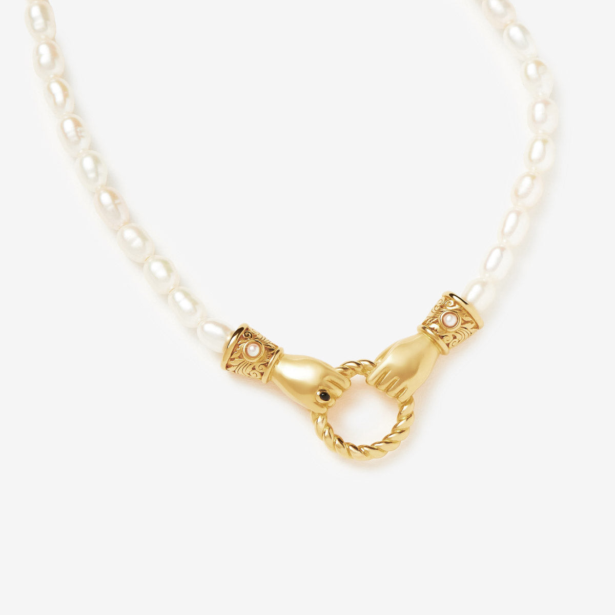 Des perles d'eau douce de forme organique sont tenues par des mains d'inspiration géorgienne dans ce magnifique collier de la collection Harris Reed x Missoma. À porter seul ou avec le bracelet de perles In Good Hands assorti.