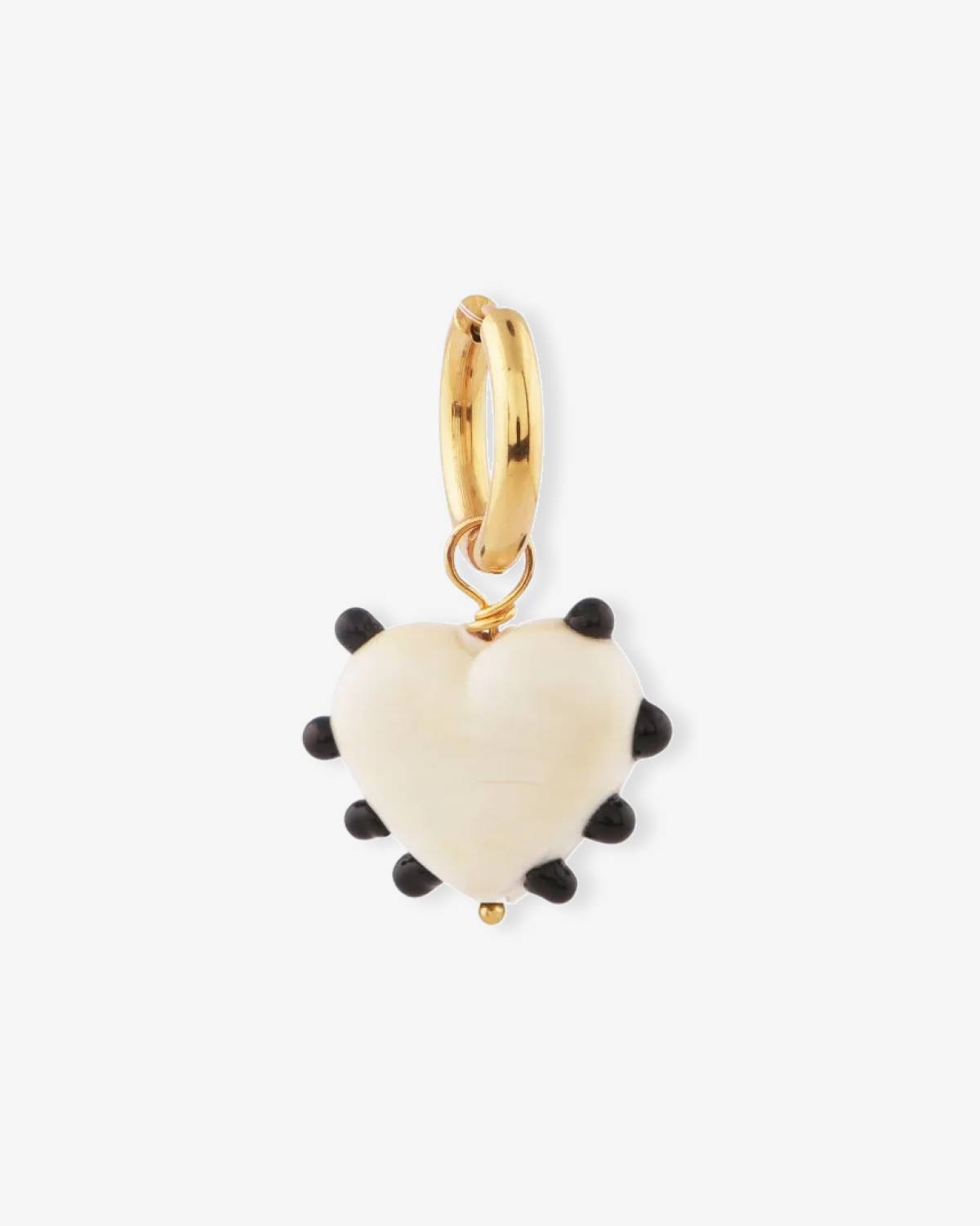 Die Milagros Heart Single Ivory Creole aus 18kt vergoldetem Finish bringt verspielte Eleganz in deinen Look. Der zarte, elfenbeinfarbene Herz-Anhänger wird von kleinen dunklen Details umrahmt und setzt einen modernen Eyecatcher am Ohr. Als Single-Creole perfekt zum Mix & Match – leicht, stylisch und ideal für jeden Tag mit Extra-Cute-Faktor.