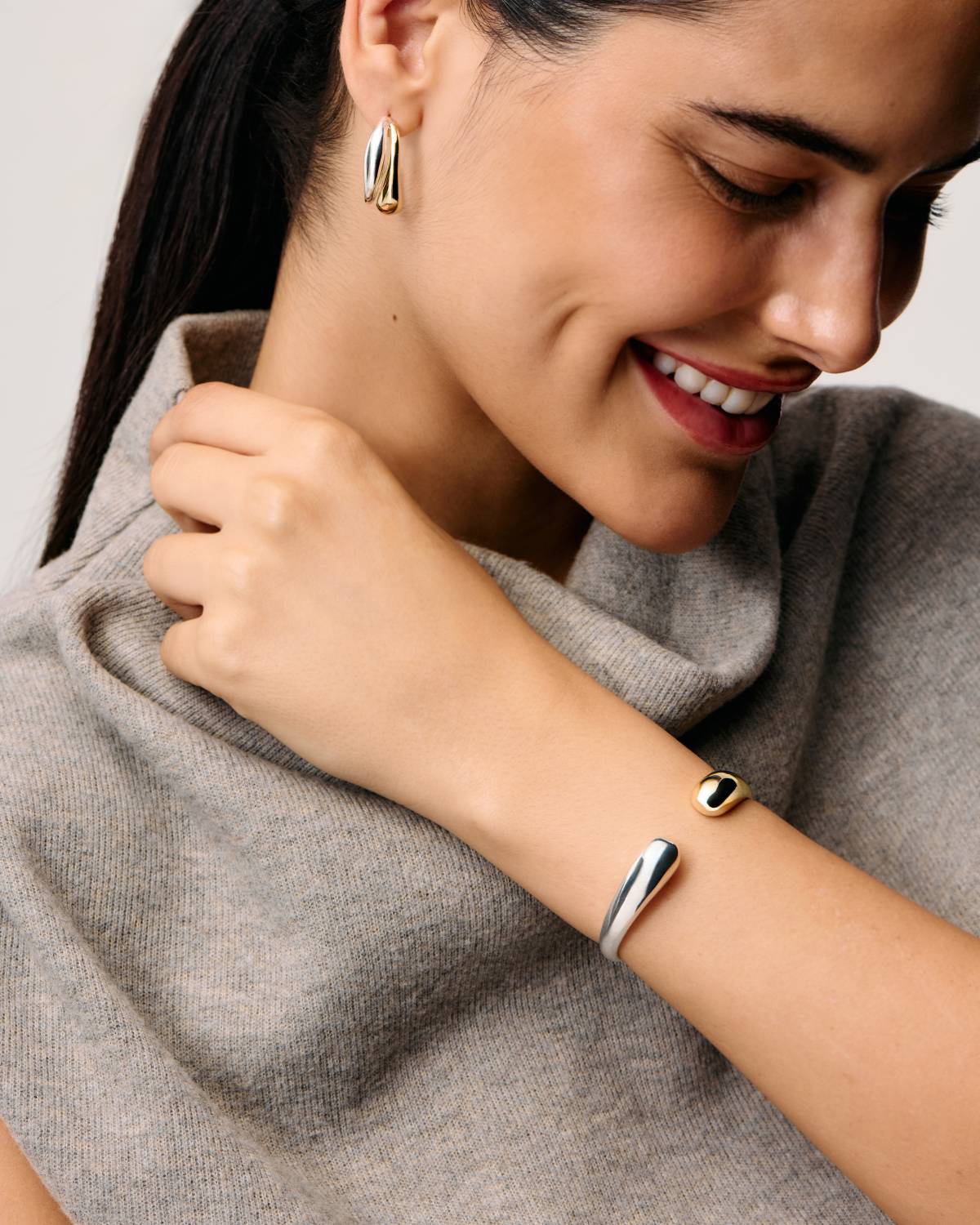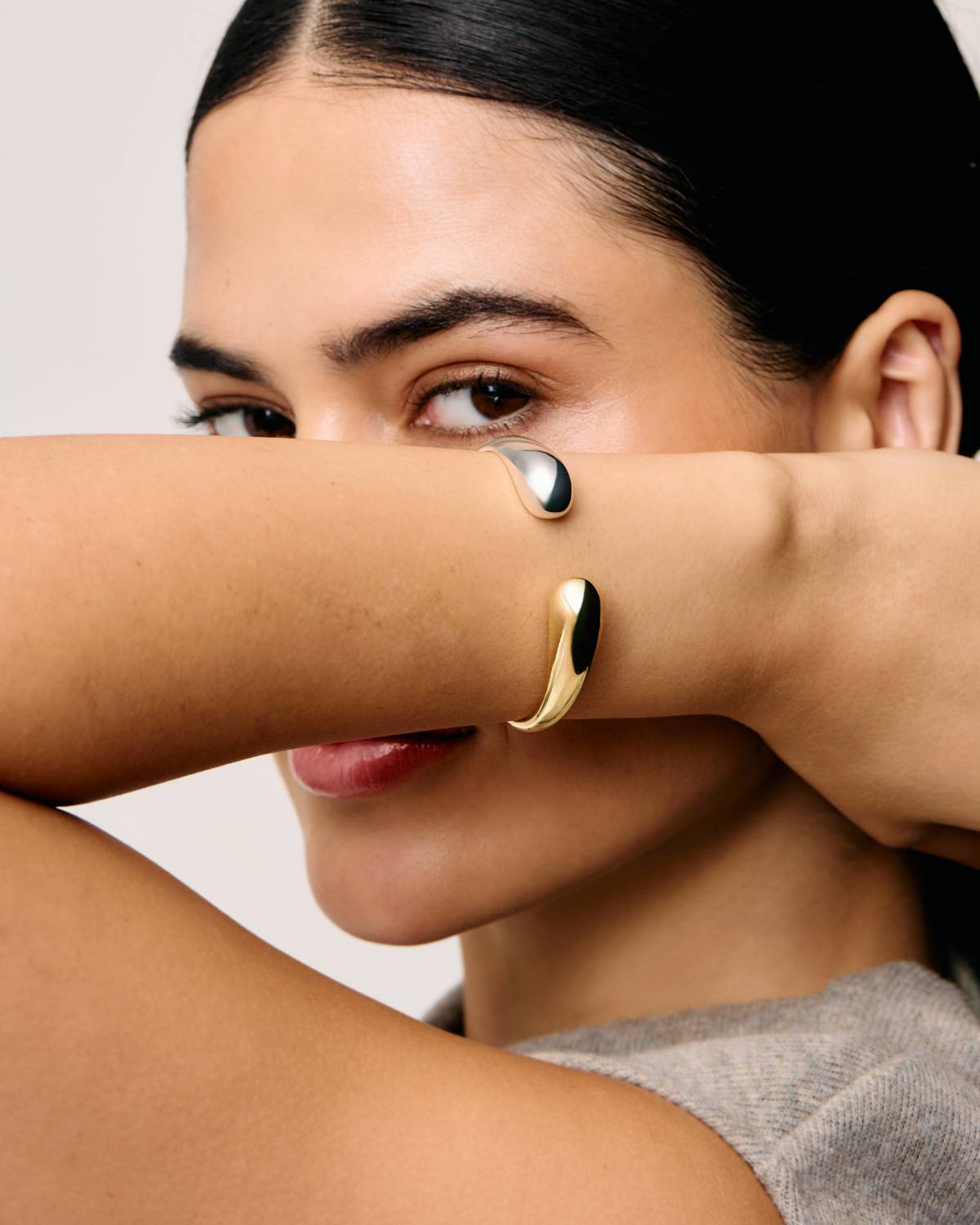 Cool, klar, charakterstark: Der Chubby Embrace Cuff Two Tone von Pompidou kombiniert 18kt Vergoldung und Silber-Finish in einem fließenden Design. Die offene, geschwungene Form legt sich wie eine moderne Umarmung ums Handgelenk und sorgt für einen kraftvollen Two-Tone-Look. Minimalistisch, bold und perfekt für jeden Day-to-Night-Style.