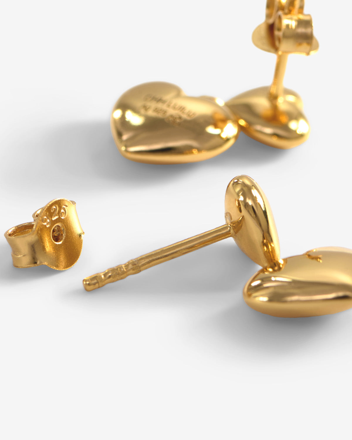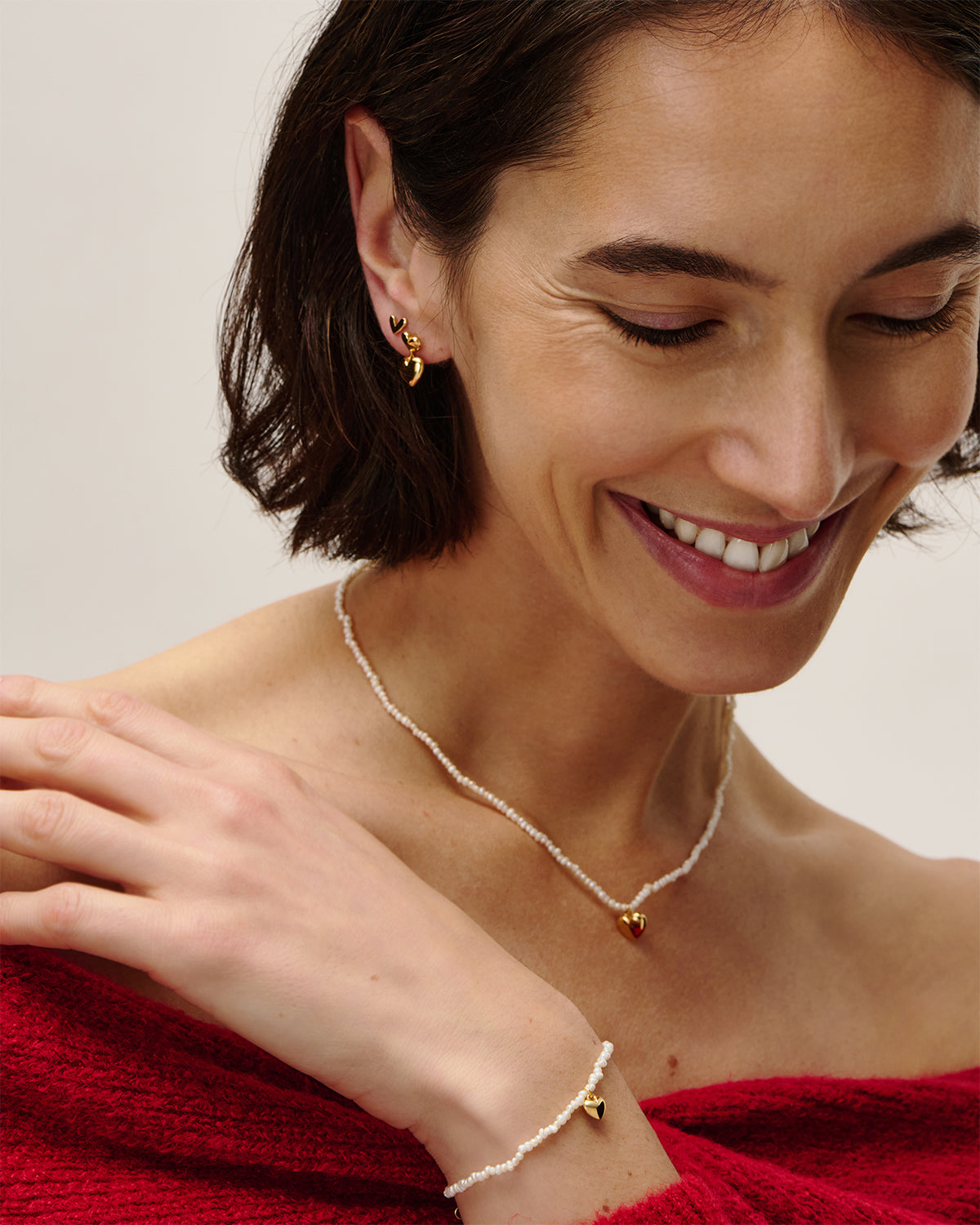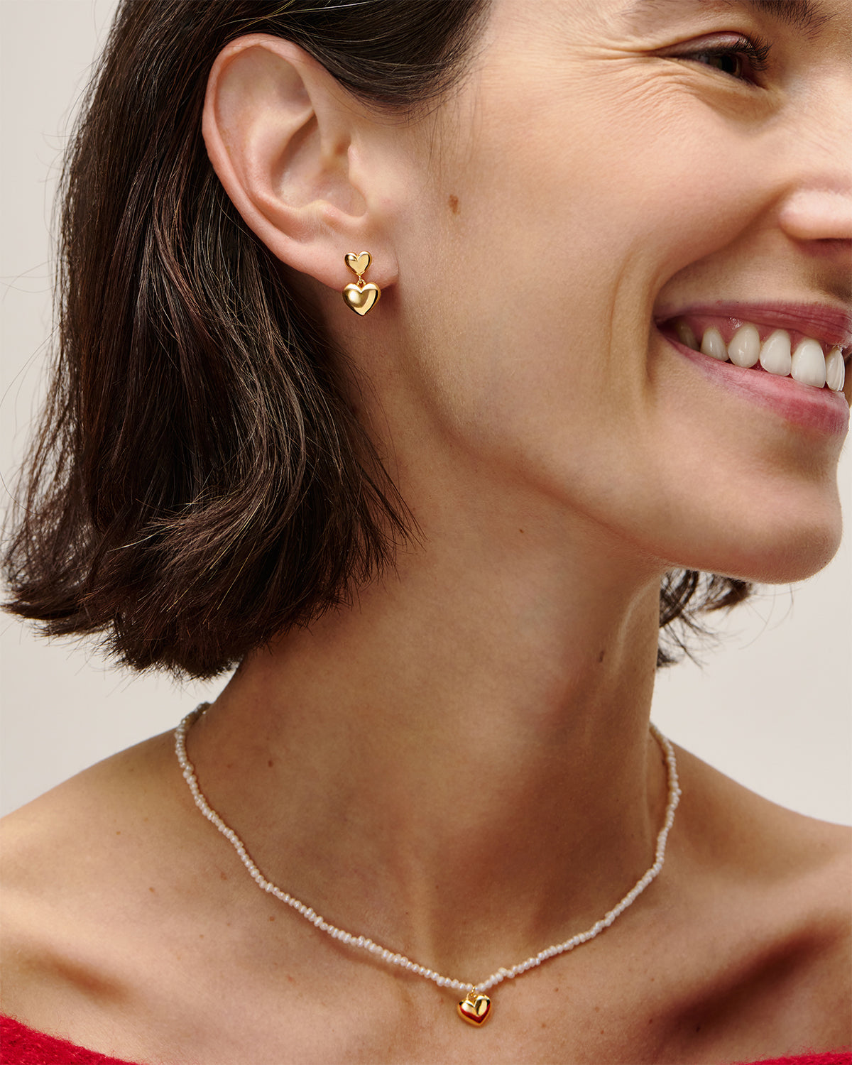 Die Double Love Drops Ohrhänger – 18kt vergoldet verbinden zwei sanft geformte Herzen mit einem fließenden Tropfenelement zu einem harmonischen Design mit modernem Twist. Die glänzende Vergoldung bringt Wärme ins Spiel, während die beweglichen Elemente bei jedem Schritt lebendig schwingen. Ein ausdrucksstarkes Piece zwischen Zartheit und Statement.