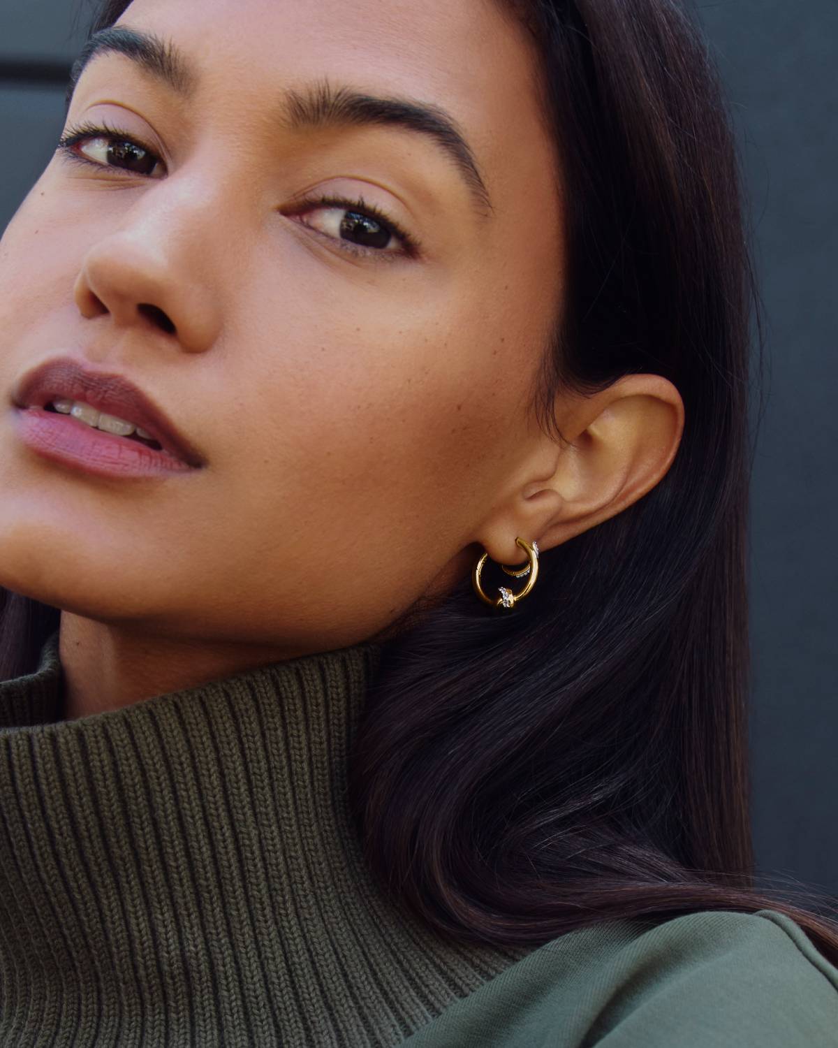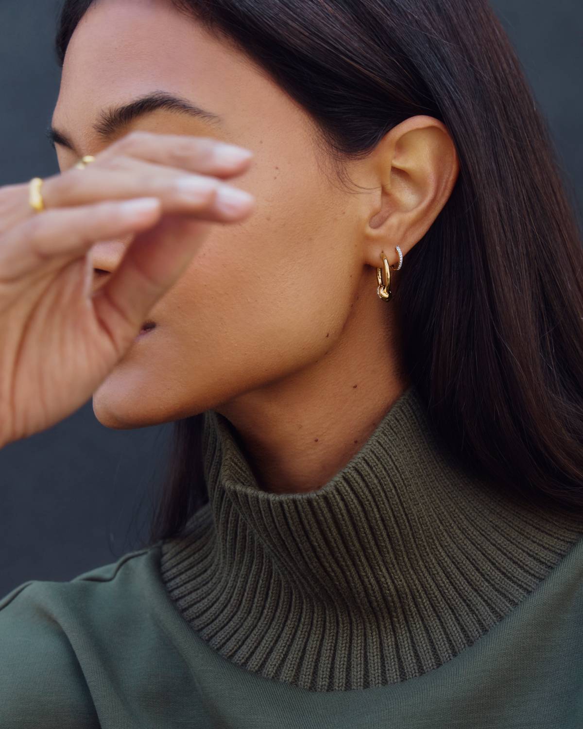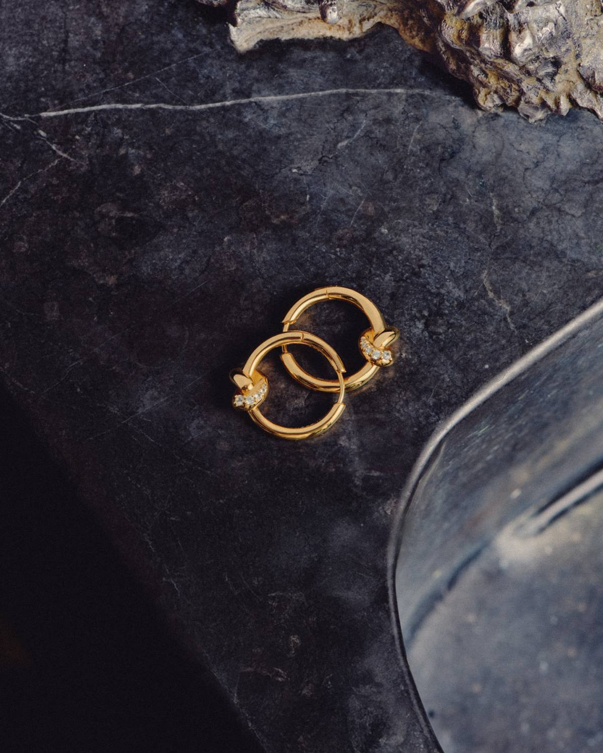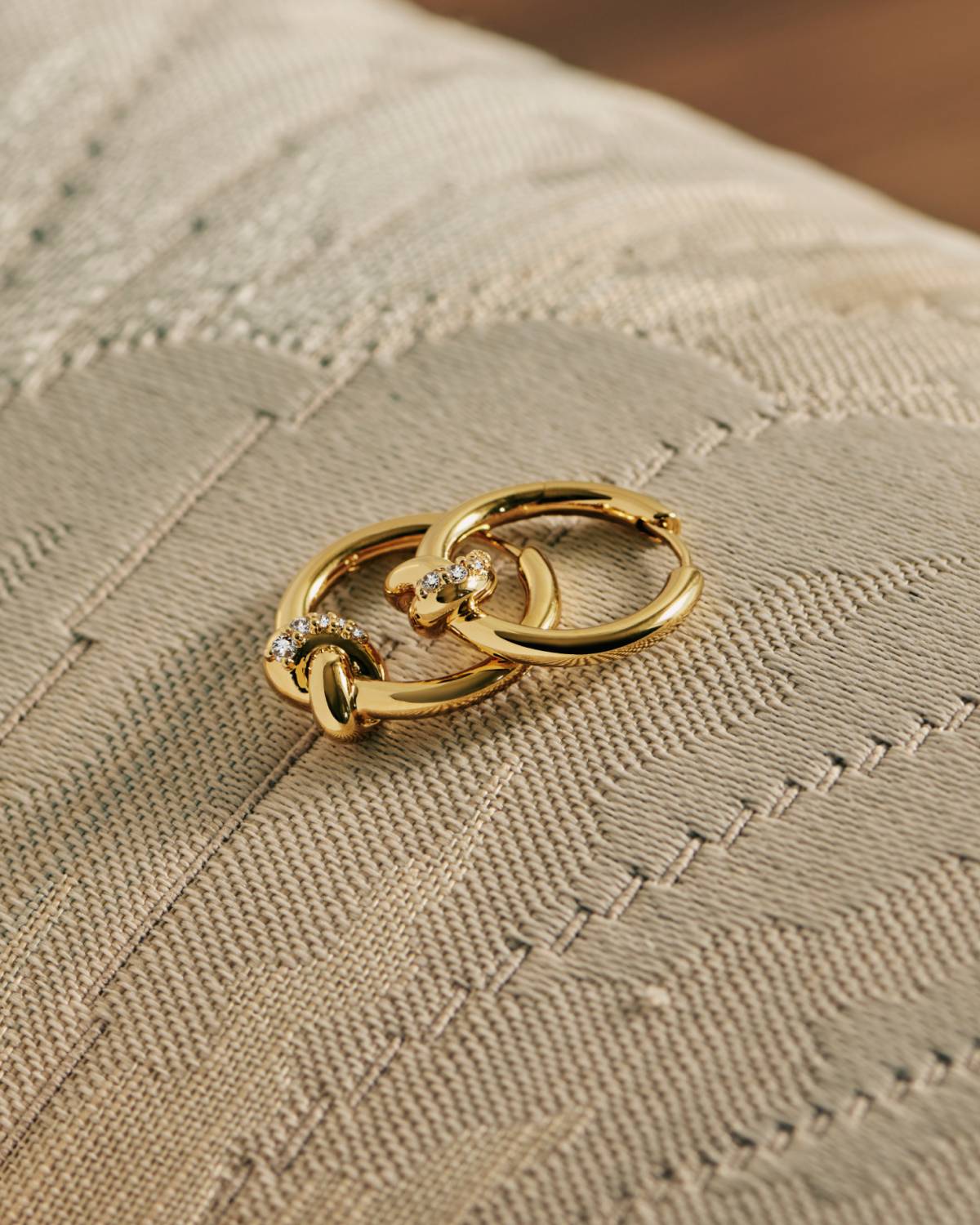 Subtle Sparkle, Maximum Charm! Die Pavé Knot Creolen glänzen mit ihrem zarten Knoten, besetzt mit funkelnden Steinen. Die 18kt Vergoldung verleiht dem Design einen modernen Glow – kleine Creolen, die jedes Outfit upgraden.