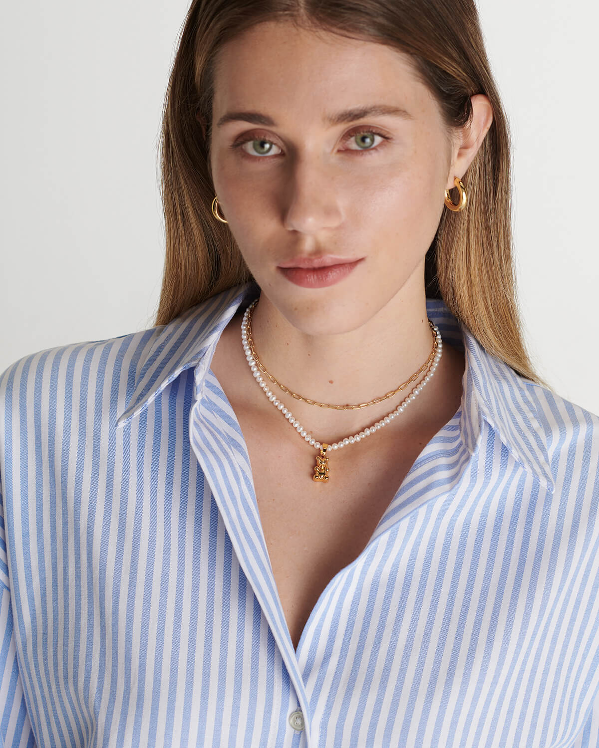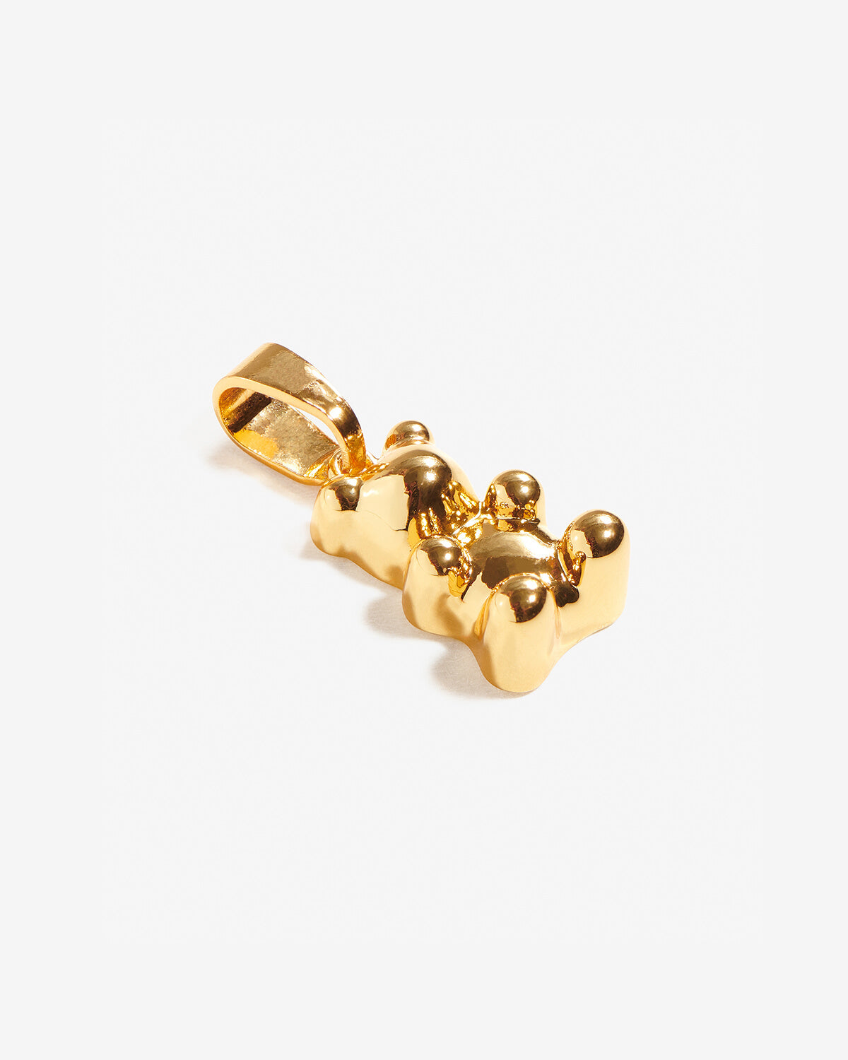 Dieser süße Kettenanhänger von Crystal Haze besticht durch das nostalgische Design eines Gummibärchens. Vielseitig kombinierbar, vervollständigt er jedes Outfit. Ob an Halsketten, Armbändern oder Fußkettchen getragen – das 18kt vergoldete Messing macht ihn zu einem echten Hingucker.