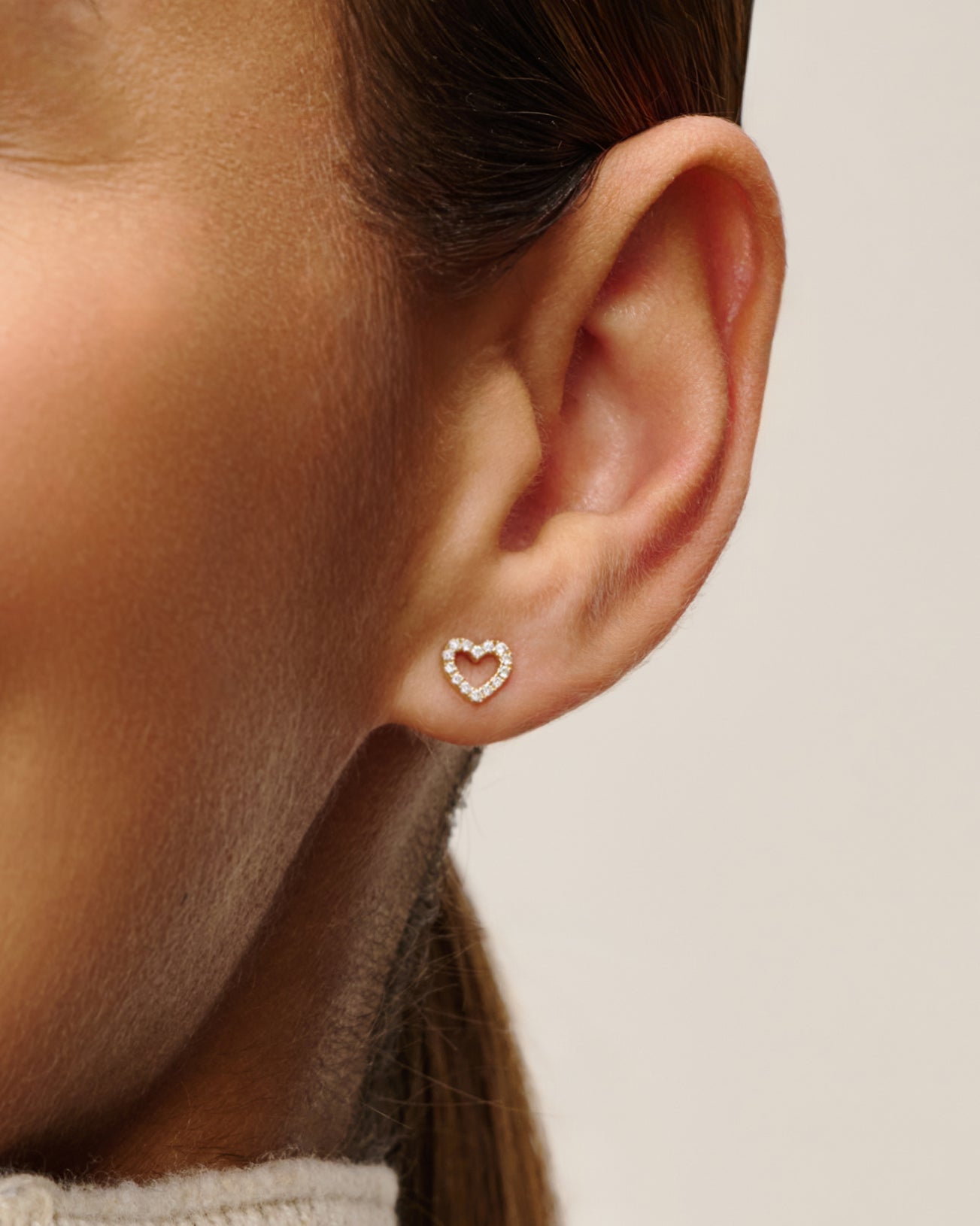 Ein funkelndes Statement der Liebe! Der Heart Ohrstecker aus 14kt Echtgold-Plating verführt mit seinem offenen Herzdesign, das von glitzernden Diamant-Steinen umrahmt wird. Die feine Balance aus zarter Form und luxuriösem Glanz macht ihn zum modernen Klassiker mit verspieltem Twist – ein Stück, das jedes Lächeln zum Strahlen bringt.