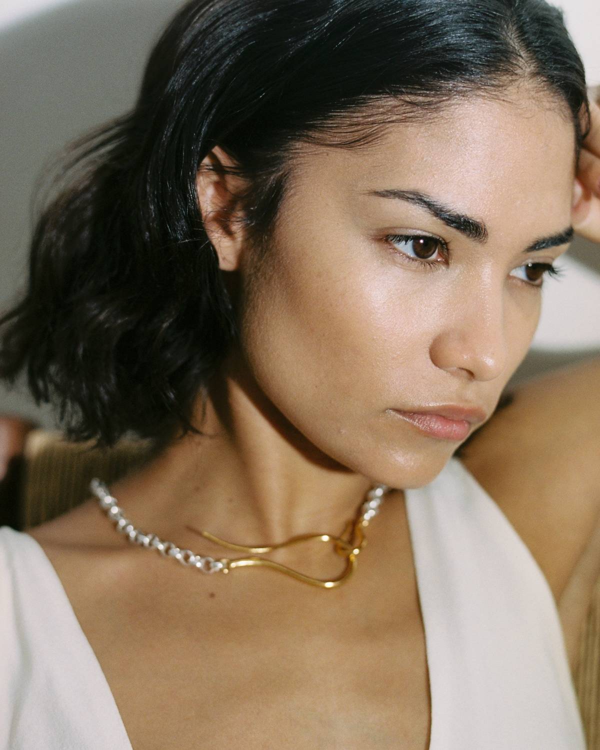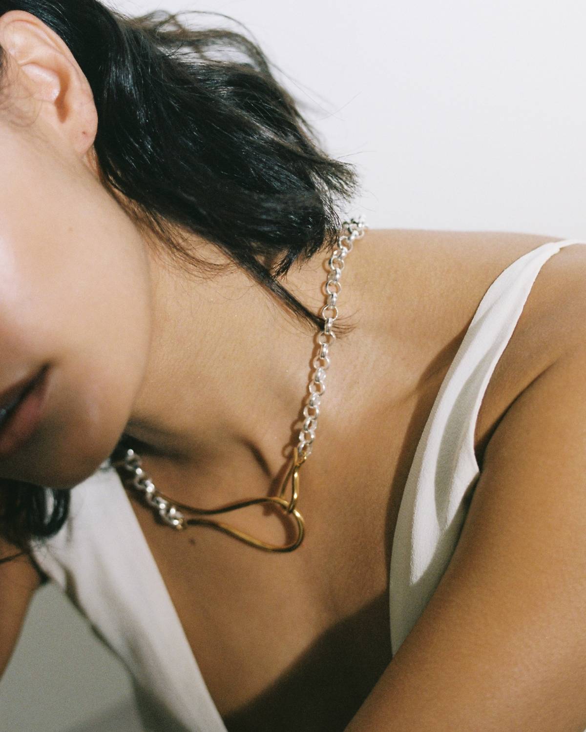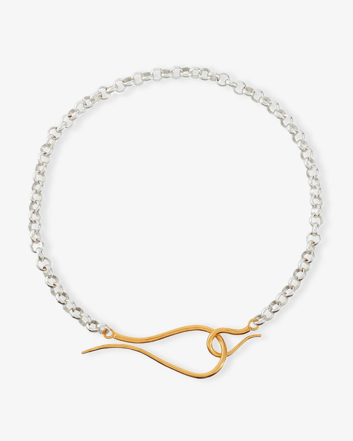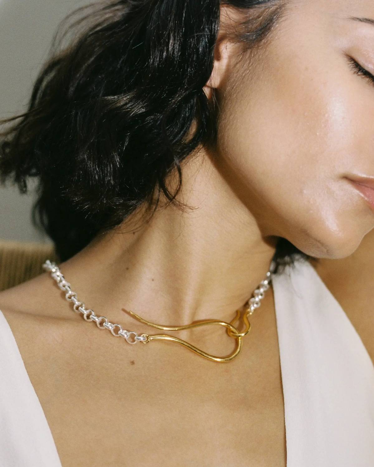 Chunky Chain trifft auf goldenes Statement! Das „Hook Necklace Mixed“ von Shyla London kombiniert coole Silberglieder mit einem verspielten Haken-Verschluss in glänzendem Gold. Ein Eyecatcher, der edgy und elegant zugleich ist – perfekt, um deinem Look ein Trend-Upgrade zu verpassen. Ob solo getragen oder im Layering: Dieses Piece sorgt garantiert für Wow-Momente!